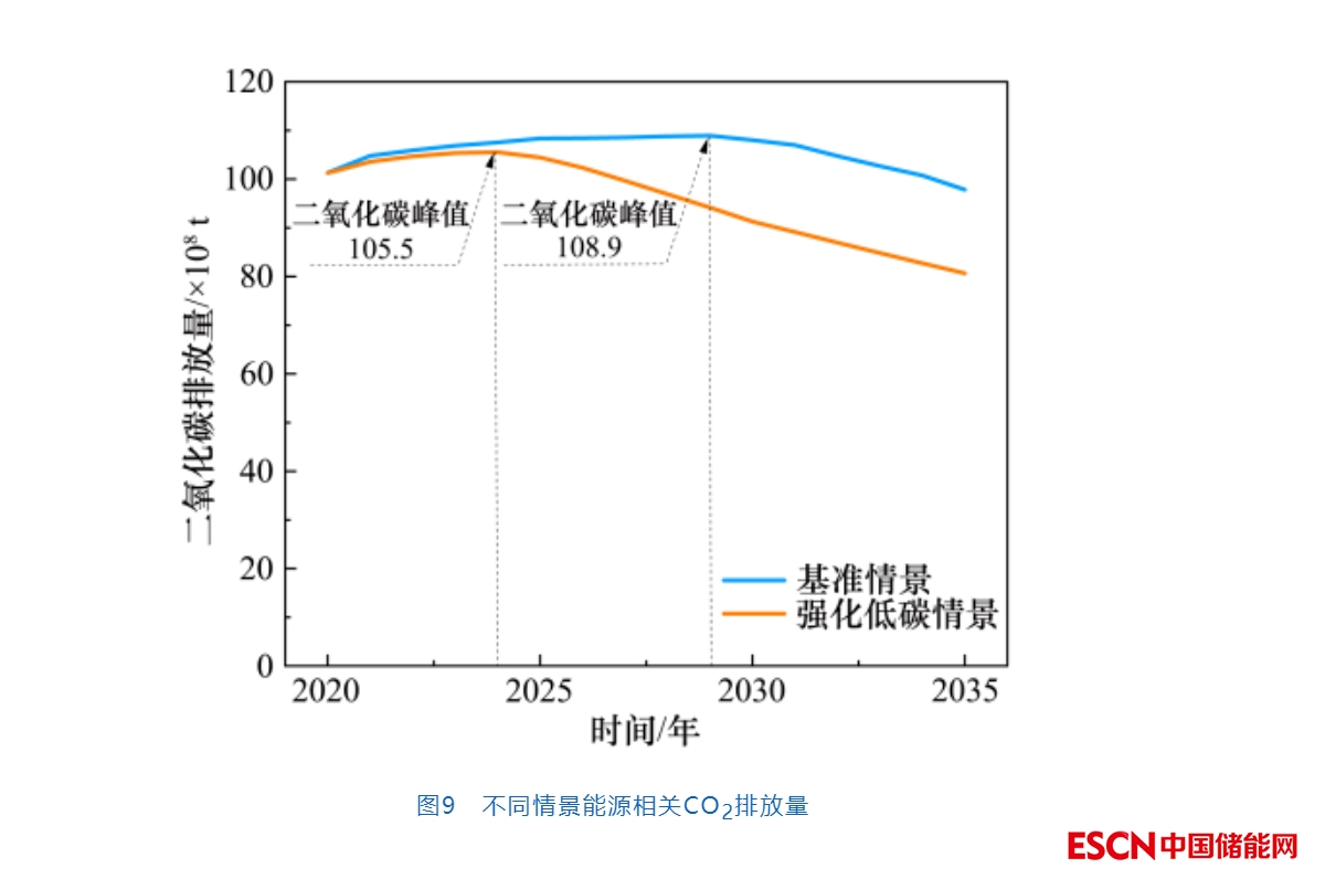 電力低碳轉(zhuǎn)型對“雙碳”目標(biāo)的實(shí)現(xiàn)具有全局性意義??紤]不同外部因素的作用大小,預(yù)計(jì)2035年全社會用電量將從2021年的8.31×1012 kW·h提高到9.8×1012 kW·h(基準(zhǔn)情景)~1.22×1013 kW·h(強(qiáng)化低碳情景)。這主要?dú)w因于電氣化的快速發(fā)展,包括電力替代煤炭、石油等化石能源直接燃燒和利用,或以可再生電力等制氫,以及終端部門電氣化的強(qiáng)化等。電源結(jié)構(gòu)整體呈現(xiàn)清潔化發(fā)展的態(tài)勢,煤電裝機(jī)量和發(fā)電量占比不斷下降,非化石能源裝機(jī)和發(fā)電量的占比穩(wěn)步提升。電源總裝機(jī)從2020年的2.2×109 kW增加至2035年的3.6×109 kW,增加了64.0%。煤電裝機(jī)總量下降至1×109 kW以下,相較2020年下降9.6%。氣電裝機(jī)總量超過2×108 kW,相較2020年增加122.5%??稍偕娏ρb機(jī)合計(jì)超過2.1×109 kW,是2020年的2.4倍。發(fā)電總量從2020年的7.6×1012 kW·h提高至1.27×1013 kW·h,增加了66.3%。其中,來自風(fēng)能、太陽能的可再生電力發(fā)電量增加了近5倍,氣電發(fā)電量增加了1.9倍,核電發(fā)電量增加了2.4倍。從碳排放來看,電力系統(tǒng)碳排放預(yù)計(jì)在2025—2030年達(dá)峰,達(dá)峰后進(jìn)入短暫平臺期,然后開始下降(見圖11)。電力系統(tǒng)的清潔化和低碳化將對全社會的碳排放下降帶來實(shí)質(zhì)性貢獻(xiàn)。