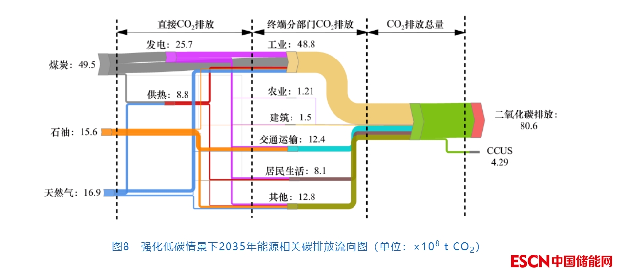 從能源相關(guān)碳排放的流向來看(見圖8),2035年煤炭、石油、天然氣相關(guān)CO2排放分別為4.95×109 t、1.56×109 t和1.98×109 t,分別占CO2直接排放的58.3%、18.4%和23.3%。2035年工業(yè)是CO2排放的最主要來源,約占直接排放的37.4%,其次為發(fā)電,約占直接排放的30.3%。對于這兩大碳排放來源行業(yè),仍需要CCUS減排技術(shù)作為兜底。當(dāng)前,我國現(xiàn)有CCUS利用項(xiàng)目仍以示范為主,主要涉及電力、煤化工、石油化工、水泥、鋼鐵等領(lǐng)域,其中仍以電力行業(yè)應(yīng)用為主。預(yù)計(jì)到2035年,電力行業(yè)和化工行業(yè)合計(jì)可形成4.3×108 t的CO2減排能力,從而使CO2排放總量進(jìn)一步降低。
