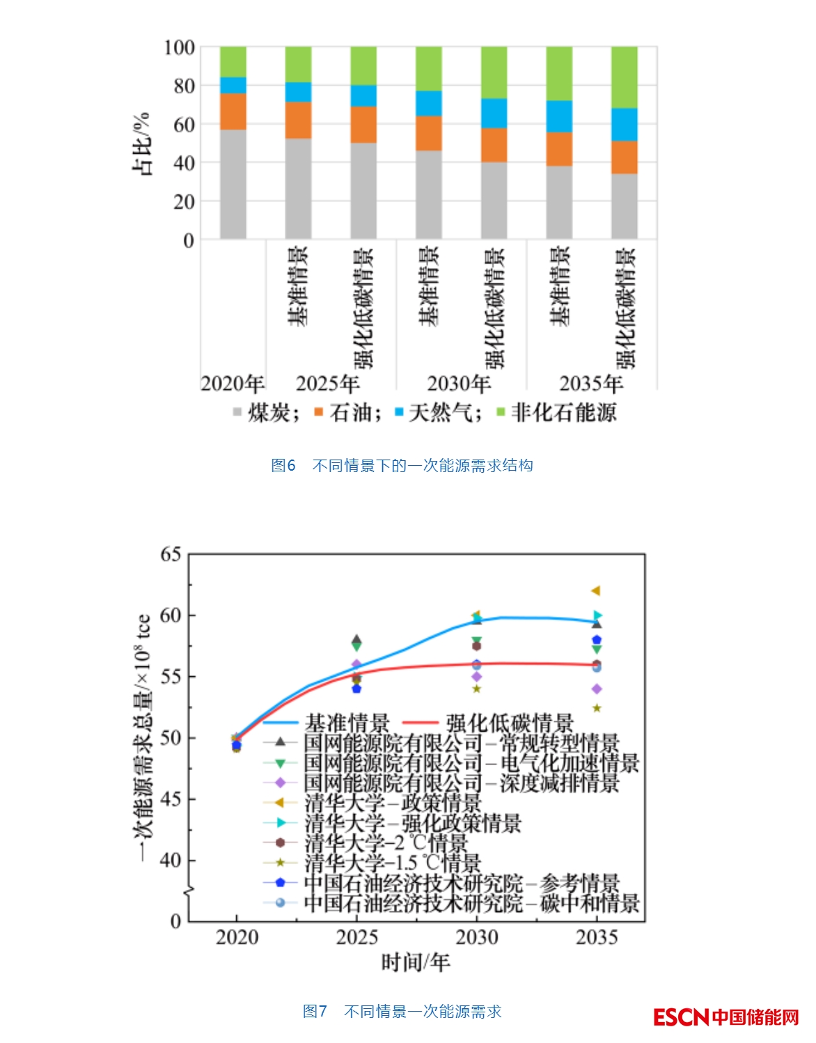 從未來能源消費(fèi)格局看,能源消費(fèi)的主要部門依然是以工業(yè)為主。2020年,我國終端能源消費(fèi)總量約為3.234×109 tce(扣除用作原料、材料的能源,按電熱當(dāng)量計(jì)算),其中,工業(yè)用能占比約為62.5%。2035年,終端能源消費(fèi)總量將進(jìn)一步提升至3.527×109 tce(扣除用作原料、材料的終端能源消費(fèi)),其中工業(yè)用能占能源消費(fèi)總量的比例約為53.5%(見圖5)。終端用能結(jié)構(gòu)也將發(fā)生顯著變化,電氣化的比例將進(jìn)一步提高。例如,2035年工業(yè)部門的電氣化比例可達(dá)到37%以上,交通運(yùn)輸?shù)碾姎饣壤稍黾拥?2%以上,建筑部門電氣化水平可達(dá)到54%。在碳中和目標(biāo)的推動下,終端電氣化進(jìn)程還將不斷推進(jìn)。2035年前,我國能源需求總量仍將持續(xù)增長(見圖6)。2020年至2025年,一次能源需求總量的年均增長速度為2.1%~2.3%。基準(zhǔn)情景下,我國一次能源需求總量在2025年將達(dá)到5.57×109 tce,2035年達(dá)到5.96×109 tce。強(qiáng)化低碳情景下,2025年我國一次能源需求總量為5.52×109 tce,2035年約為5.56×109 tce(見圖7)?;鶞?zhǔn)情景下能源需求總量大約在2030年達(dá)峰。在強(qiáng)有力的政策支持和技術(shù)促進(jìn)下,我國能源需求總量有望在2030年前達(dá)到峰值然后開始下降,從而為碳中和的實(shí)現(xiàn)留出空間。由于方法設(shè)計(jì)、情景設(shè)置、政策環(huán)境、技術(shù)發(fā)展等方面的不同研判,已有研究對未來能源需求總量判斷呈現(xiàn)差異,但這些研究證實(shí)了同樣的趨勢,即能源需求總量增速將放緩。
