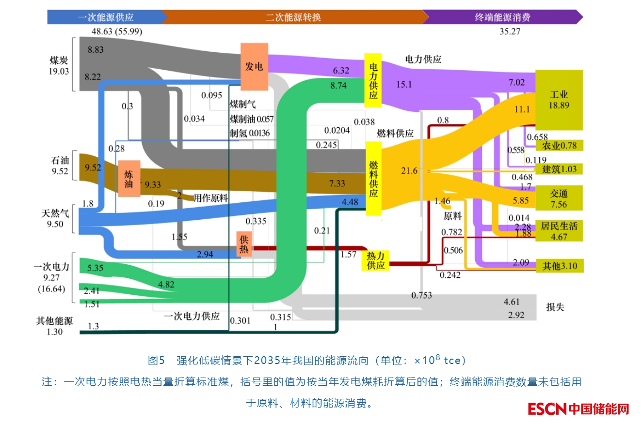 能源供應(yīng)、轉(zhuǎn)換與消費(fèi)受能源技術(shù)、經(jīng)濟(jì)社會、政策因素等多方面的綜合影響。圖5為2035年強(qiáng)化低碳情景下我國的能源供應(yīng)、轉(zhuǎn)換與消費(fèi)情況。從能源供應(yīng)能力看,2035年前煤炭在我國能源供應(yīng)中依舊發(fā)揮重要的保障作用。煤炭將提供34%左右的一次能源供應(yīng),相較2020年降低約22.8%(見圖6中強(qiáng)化低碳情景)。天然氣的供應(yīng)能力將達(dá)到9.5×108 tce,約占能源供應(yīng)總量的17%,較2020年的天然氣消費(fèi)量翻一倍。非化石能源供應(yīng)將提高至1.794×109 tce,約占一次能源供應(yīng)總量的32%。可見,煤炭依然將發(fā)揮重要的能源安全保障兜底作用,天然氣將起到重要的過渡支撐作用。隨著能源結(jié)構(gòu)不斷向綠色低碳化轉(zhuǎn)變,風(fēng)光等可再生能源在能源結(jié)構(gòu)中的占比顯著上升。相比2020年,包括風(fēng)光在內(nèi)的非化石能源占比將提高12.1~16.1個(gè)百分點(diǎn)。預(yù)計(jì)到2035年,風(fēng)電、光伏、水電等一次電力供應(yīng)能力合計(jì)將達(dá)到7.76×108 tce,占一次電力供應(yīng)總量的比例達(dá)到83.7%(見圖5)。屆時(shí),我國將基本形成煤炭、油氣和新能源“三足鼎立”的能源供應(yīng)格局。