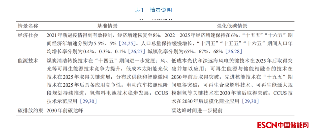 在能源需求總量高、碳排放基數(shù)大的發(fā)展現(xiàn)狀下,預(yù)測“雙碳”目標(biāo)下我國不同行業(yè)的中長期能源需求,對實(shí)現(xiàn)碳達(dá)峰、碳中和意義重大。本文通過結(jié)合我國經(jīng)濟(jì)社會發(fā)展、碳減排承諾以及能源安全新戰(zhàn)略,綜合考慮不同階段各類能源技術(shù)發(fā)展水平,設(shè)置基準(zhǔn)情景和強(qiáng)化低碳情景(見表1)預(yù)測我國中長期能源需求,進(jìn)而推演我國實(shí)現(xiàn)碳達(dá)峰、碳中和目標(biāo)的中長期能源低碳發(fā)展路徑。