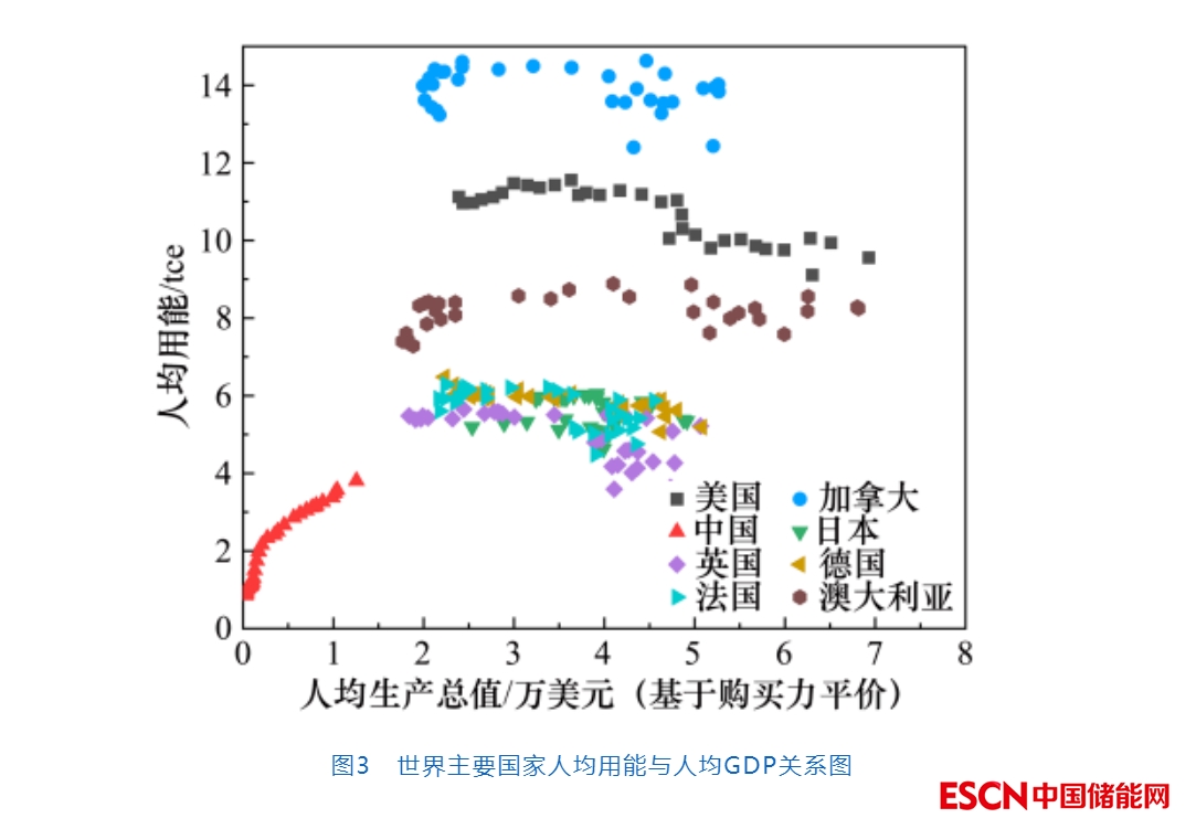 從發(fā)達(dá)國家的人均用能與人均GDP發(fā)展歷程來看(見圖3),絕大部分發(fā)達(dá)國家人均用能都已進(jìn)入了峰值,并維持平穩(wěn)增長或開始下降。美國、加拿大、澳大利亞、英國、德國、法國、日本等國家的人均用能大約都是在人均GDP 20 000~30 000美元(現(xiàn)價(jià))的時(shí)候進(jìn)入了峰值,隨后保持平穩(wěn)或緩慢下降。我國人均用能和人均GDP均處于快速增長階段,人均GDP從1990年的318美元(現(xiàn)價(jià))增加到2021年的12 556美元(現(xiàn)價(jià)),人均用能相應(yīng)地從0.86 tce增加至3.7 tce,尚未達(dá)到峰值。預(yù)計(jì)到2035年,我國的人均GDP將達(dá)到中等發(fā)達(dá)國家的水平。這期間,依然需要不斷增加的能源消費(fèi)總量來支撐我國的經(jīng)濟(jì)發(fā)展。
