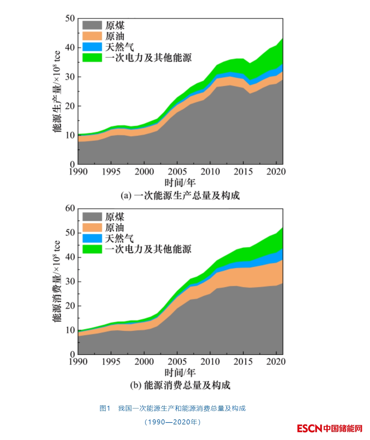 在能源供給側(cè),我國能源工業(yè)迅速發(fā)展,能源結(jié)構(gòu)加快向清潔低碳方向轉(zhuǎn)變。自改革開放以來,我國一次能源生產(chǎn)總量不斷增長,從1990年的1.0392×109 tce提高至2021年的4.33×109 tce(見圖1(a)),平均每年以4.7%的增速增長。其中,煤炭生產(chǎn)量年均增長4.4%,原油生產(chǎn)量年均增長1.2%,天然氣年均增長8.5%,一次電力及其他能源生產(chǎn)年均增速達(dá)9.7%。電力發(fā)展迅速,供應(yīng)能力持續(xù)增強(qiáng),2021年累計(jì)發(fā)電裝機(jī)容量達(dá)到2.377×109 kW,發(fā)電量8.377×1012 kW·h,較2000年分別增長了6.44倍和5.12倍。可再生能源利用規(guī)??焖贁U(kuò)大,水電、風(fēng)電、光伏發(fā)電累計(jì)裝機(jī)容量均居世界首位。截至2022年3月31日,我國運(yùn)行核電機(jī)組共54臺,裝機(jī)容量55 805.74 MWe,居世界第二。此外,能源輸送能力顯著提高,能源儲備體系也不斷健全。不斷提升的能源供給能力為我國國民經(jīng)濟(jì)的持續(xù)快速發(fā)展提供了堅(jiān)實(shí)的保障與支撐。