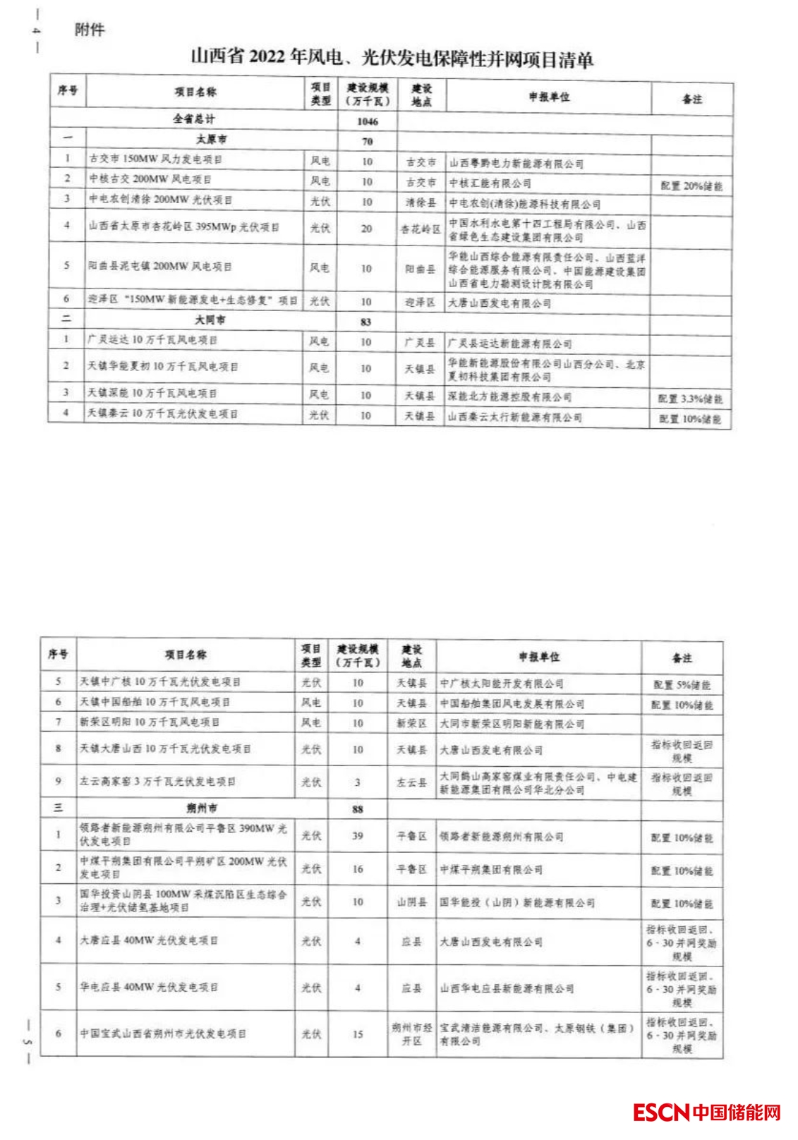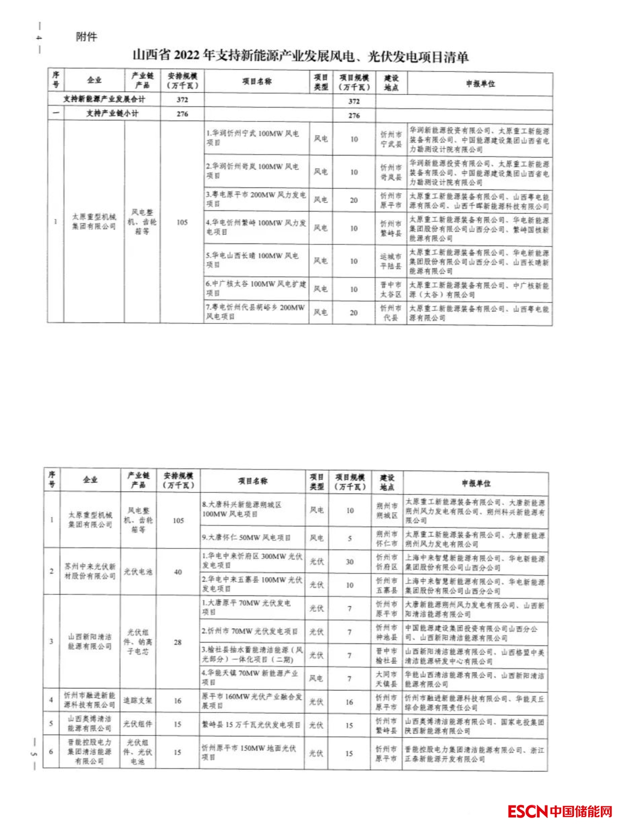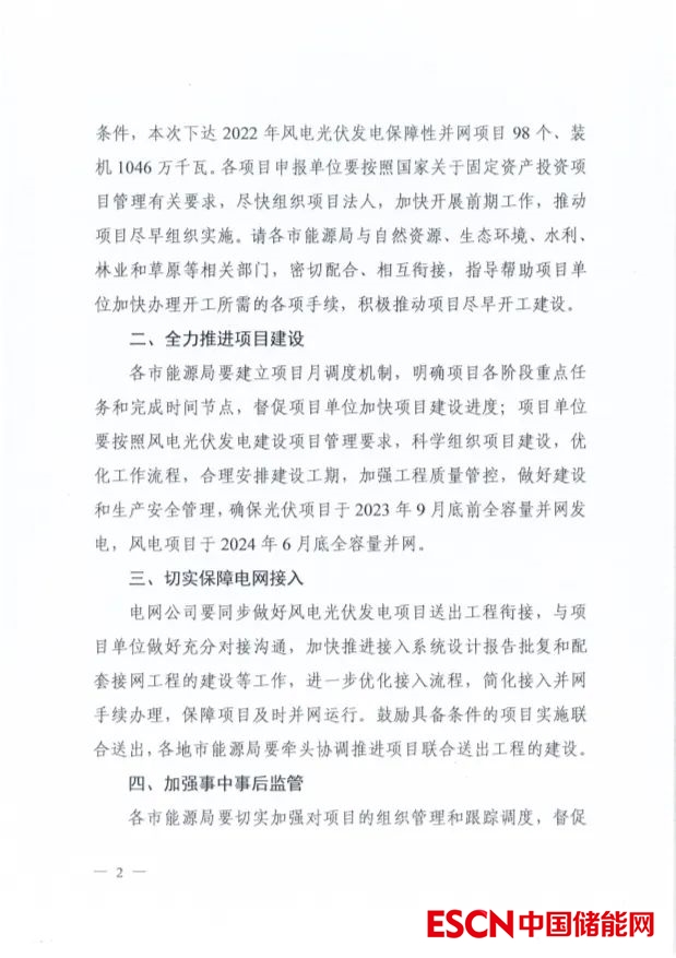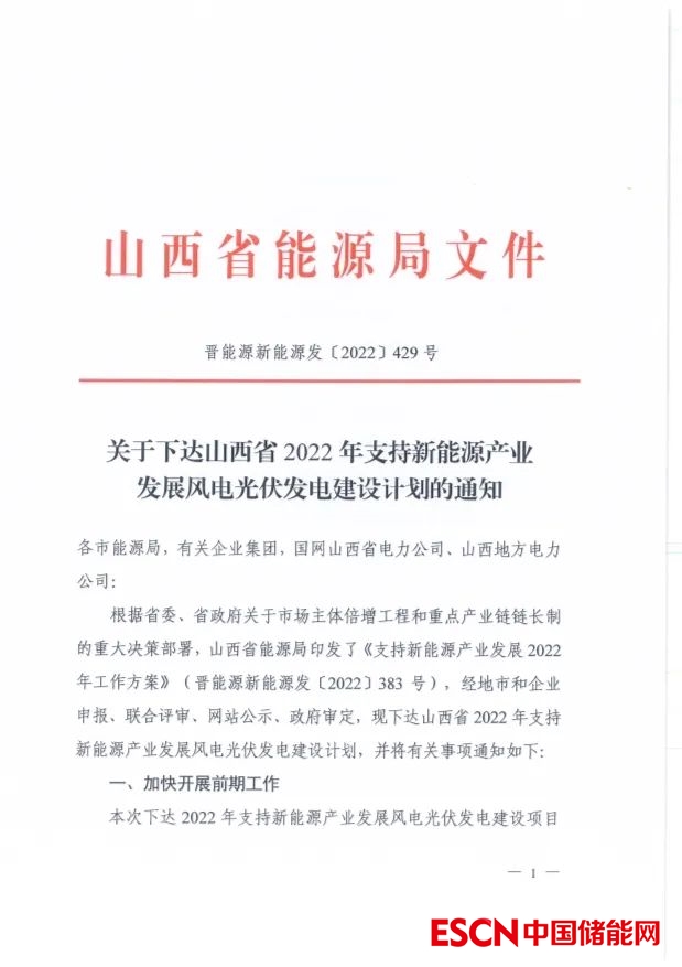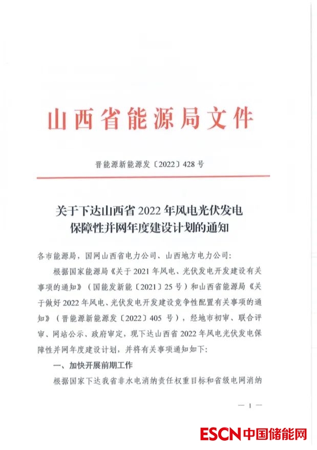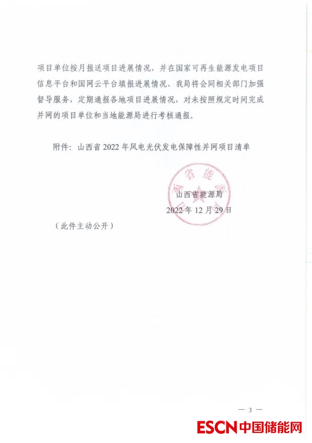 中國儲能網(wǎng)訊:2022年12月30日,山西省能源局發(fā)布2022年保障性并網(wǎng)和支持新能源風(fēng)光項目名單,共98個項目,裝機規(guī)模10.46GW,其中31個項目要求配置儲能,按照風(fēng)光項目裝機規(guī)模的2.5%-20%配置。本次下達的保障性并網(wǎng)光伏項目要求于2023年9月底前全容量并網(wǎng)發(fā)電,風(fēng)電項目于2024年6月底全容量并網(wǎng)。同日,山西能源局下達2022年3.72GW,34個支持新能源產(chǎn)業(yè)發(fā)展風(fēng)電、光伏發(fā)電建設(shè)項目清單,此類項目要求于2024年12月底全容量并網(wǎng)。