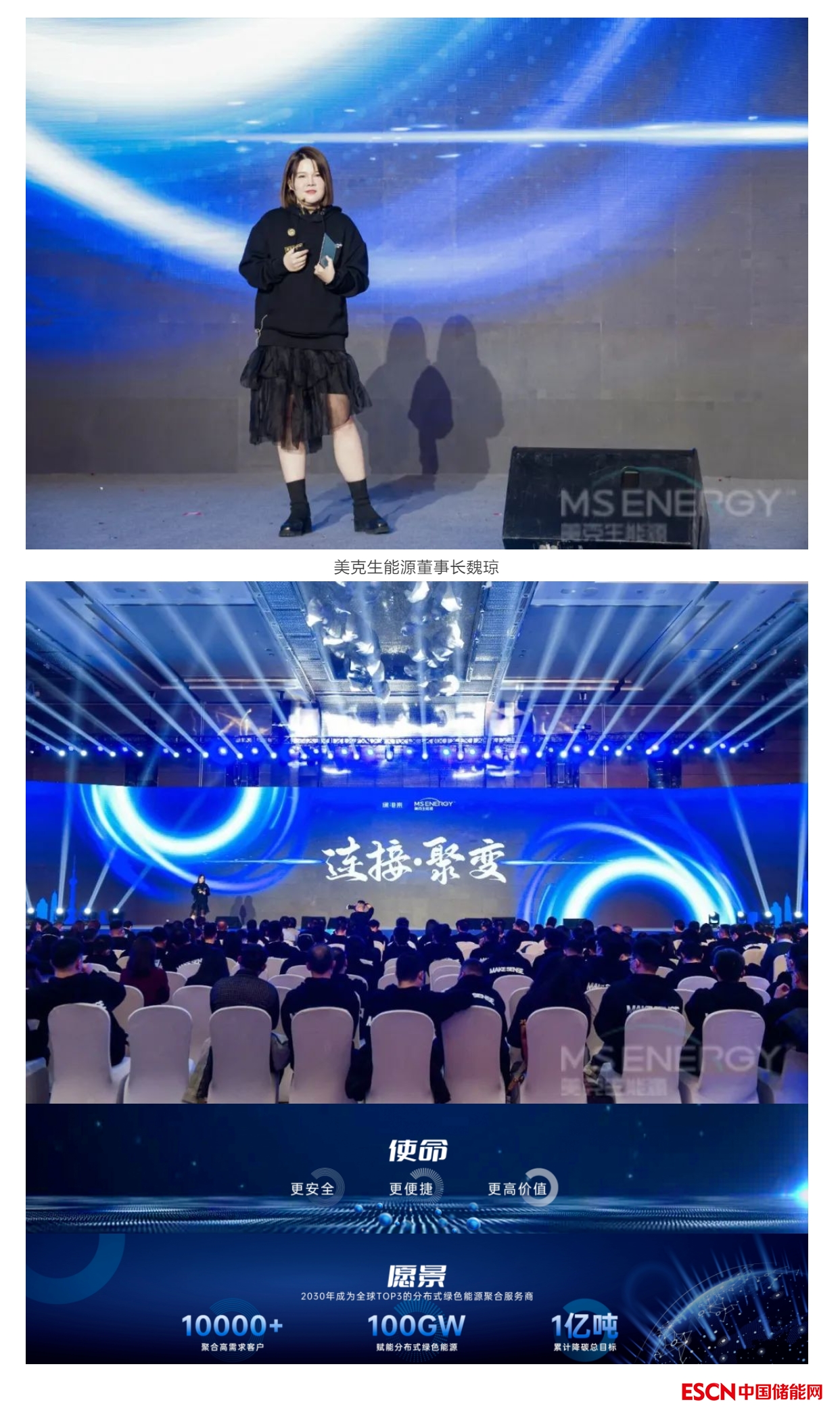 全新升級靠譜使命,構(gòu)建低碳綠能世界,推動綠電普惠人民。會上,美克生能源董事長魏瓊帶來“連接 · 聚變”的主題分享,重磅發(fā)布了美克生能源在發(fā)展新階段的使命、愿景、價值觀。