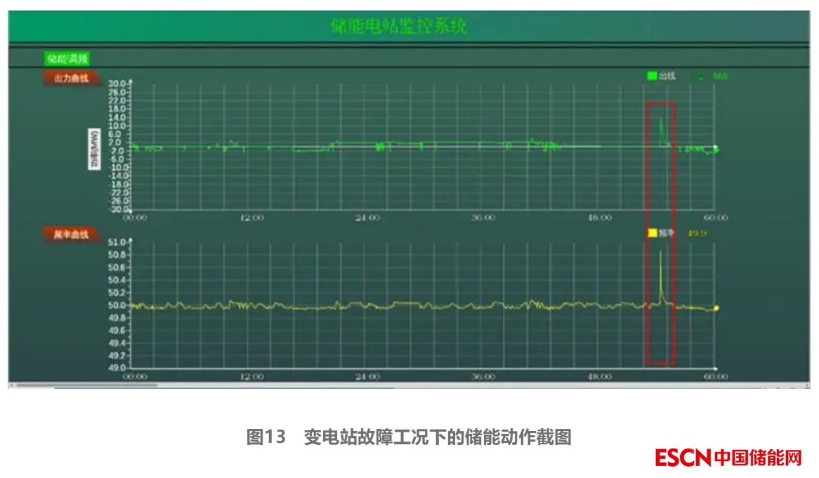圖13是孤網(wǎng)內(nèi)一臺100 MW變壓器主變跳變導(dǎo)致全網(wǎng)負荷損失20%的情況,在無輔助調(diào)頻情況下需要高頻切機以保障系統(tǒng)穩(wěn)定運行。此網(wǎng)中儲能電站迅速進行了異常參數(shù)捕捉,且完成準確功率輸出,有效支撐電網(wǎng)頻率穩(wěn)定性,保障火電機組平穩(wěn)運行,避免高頻切除水電機組的情況。