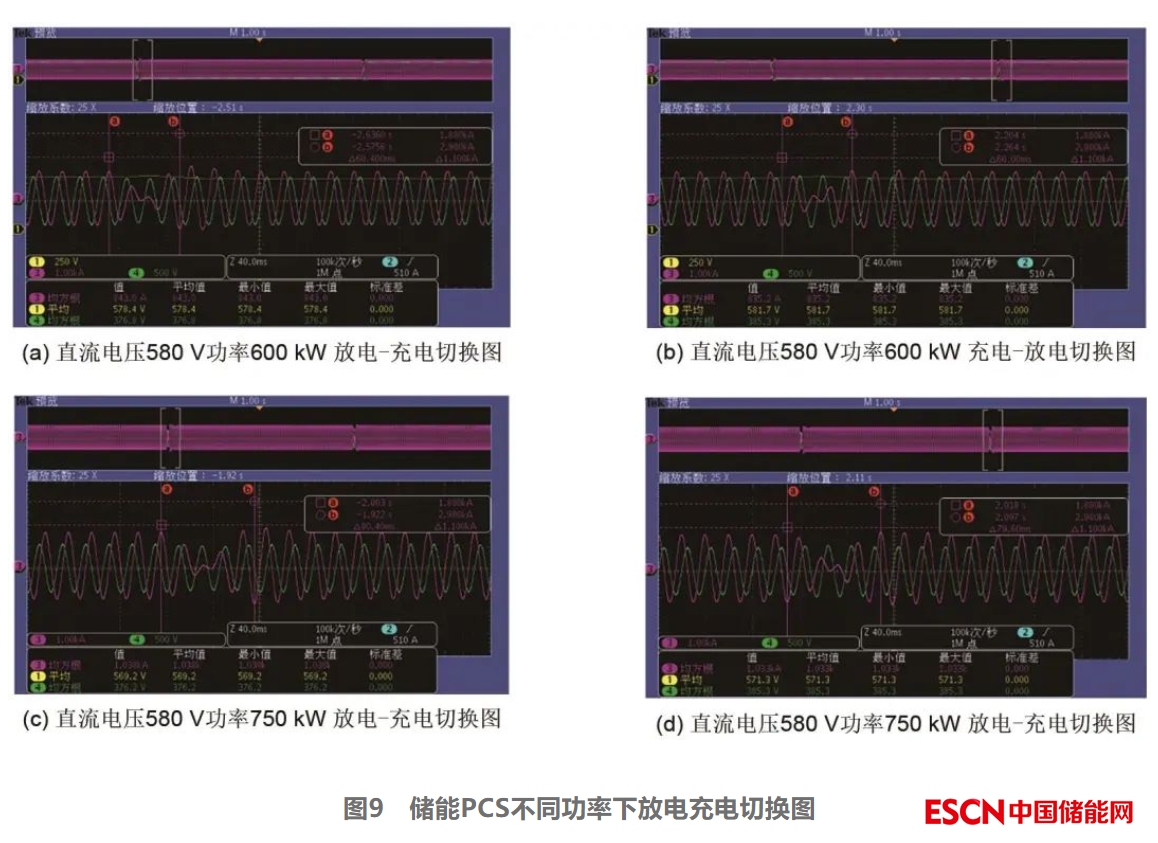 采用文中所提過載能力提升思路對500 kW儲能PCS優(yōu)化設(shè)計后,在過載情況下對其性能進行驗證。該儲能PCS直流側(cè)電壓范圍為580~850 V,圖9為其充放電轉(zhuǎn)換示波器截屏圖,為保證全SOC范圍內(nèi)的電流過載能力,測試的直流側(cè)電壓為最低點580 V,即相同功率下的最大過載電流。