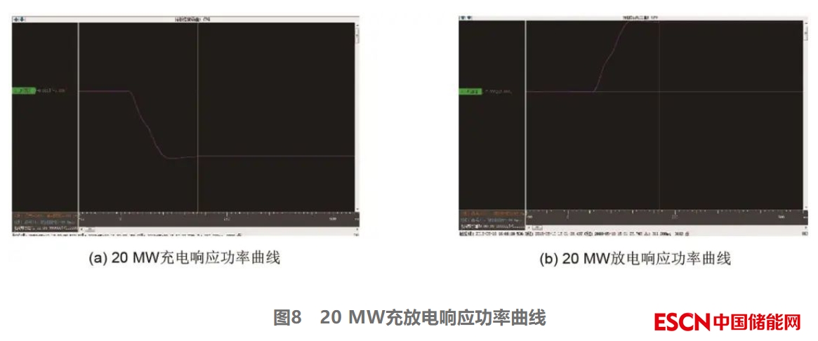 通過電網(wǎng)分布式安穩(wěn)系統(tǒng)終端給儲能電站站級監(jiān)控系統(tǒng)(EMS)下發(fā)指令,控制儲能系統(tǒng)充放電,用功率分析儀和故障錄波裝置(南瑞繼保PCS-996R)測試了儲能電站在20 MW額定功率下的功率時間特性曲線和響應(yīng)時間曲線,如圖8所示,通過本工作所提響應(yīng)時間優(yōu)化后,儲能電站完成20 MW出力,充電響應(yīng)時間為181 ms,放電響應(yīng)時間為212 ms。