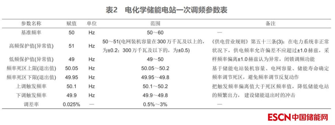 在設(shè)置電化學(xué)儲能電站的一次調(diào)頻參數(shù)時,除了作為調(diào)頻電源的調(diào)頻死區(qū)、調(diào)差率等,還需要考慮電化學(xué)儲能電站在偏離額定功率出力時的運行效率較低,以及頻繁啟停對運行壽命的影響等因素。同時,還要分析沒有慣性的儲能電站投入或者退出時對電網(wǎng)的沖擊,防止形成新的擾動。為此,調(diào)頻參數(shù)還需要增加上調(diào)或者下調(diào)時的啟動頻率和截止頻率參數(shù),以控制儲能電站的動作頻次,考慮慣量支撐,對于調(diào)差率也可進行分區(qū)設(shè)置,進而確保儲能電站在一次調(diào)頻時發(fā)揮最大效能,同時降低電站運行及壽命折舊成本。具體參數(shù)設(shè)置如表2所示。