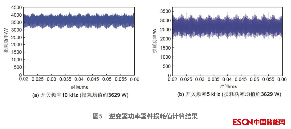 本工作通過功率器件損耗值表達儲能PCS過載能力提升效果,因此通過對電壓與電流乘積進行積分,計算變流器內(nèi)部全部功率器件的鉗位二極管的損耗功率,其結(jié)果如圖5所示。