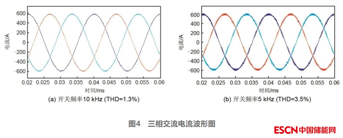 目前儲能電站用變流器類型多為三電平變流器,其中影響開關(guān)頻率的重要因素為其調(diào)制方式,常見調(diào)制方式包括脈寬調(diào)制(PWM)、正選脈寬調(diào)制(SPWM)及空間矢量脈寬調(diào)制(SVPWM)等。三電平SVPWM調(diào)制分為七段式、九段式等不同矢量插入形式,零矢量插入形式不同導(dǎo)致開關(guān)動作次數(shù)及頻率不同,隨著段數(shù)增加變流器開關(guān)頻率增大,功率器件損耗增大。因此,降低功耗需要適當減少開關(guān)頻率,同時避免諧波超標。本工作通過隨工況變化的開關(guān)頻率控制實現(xiàn)功率器件結(jié)溫調(diào)控,即儲能PCS正常工作(未超過其滿載條件)時,變流器則采用九段式SVPWM調(diào)制方式;當儲能PCS過載工況時,流經(jīng)PCS電流IPCS會超過其額定大小,此時變流器則采用七段式SVPWM調(diào)制方式,降低開關(guān)頻率,有效減小功率器件熱耗,進而降低最高結(jié)溫,提升PCS過載能力。本工作構(gòu)建三電平的儲能PCS仿真模型,仿真中除開關(guān)頻率外,其他參數(shù)保持完全相同,PCS額定功率為500 kW,直流側(cè)電壓1200 V,交流輸出電壓690 V(線電壓),交流電流416 A,開關(guān)頻率10 kHz,仿真電流波形如圖4所示。