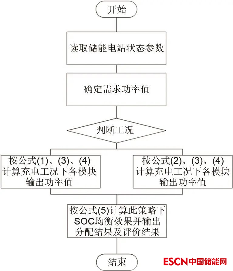 儲能電站一次調(diào)頻響應(yīng)時間優(yōu)化可從影響運算周期的控制策略與求解算法兩方面入手。選用簡單、有效的策略和求解速度快、可靠性較高算法可縮短儲能電站運算回路周期,進而提高儲能電站動態(tài)響應(yīng)性能。電力系統(tǒng)控制策略的求解算法主要包括經(jīng)典數(shù)學(xué)方法、智能優(yōu)化算法、強化學(xué)習(xí)等,綜合不同求解算法特點與儲能電站設(shè)計工況,本工作選用求解速度快、可靠性高的內(nèi)點算法?,F(xiàn)有一次調(diào)頻策略大致分為下垂控制、慣性下垂控制以及虛擬同步機VSG控制等,通過不同策略特點分析,本工作選取SOC比例均衡控制策略,其保證響應(yīng)時間的同時能夠減少因各儲能單元SOC不均衡導(dǎo)致的損害電池健康的問題。該策略思想為根據(jù)各儲能電池組SOC狀態(tài)確定其輸出功率修正系數(shù),該系數(shù)定義為SOC均衡因子圖片,具體策略流程如圖3所示,當需要儲能電站放電時,根據(jù)電池組SOC從高到低對圖片依次賦值。當需要儲能電站充電時,根據(jù)電池組SOC從低到高對圖片依次賦值,SOC均衡因子表達式如式(1)~(4)。