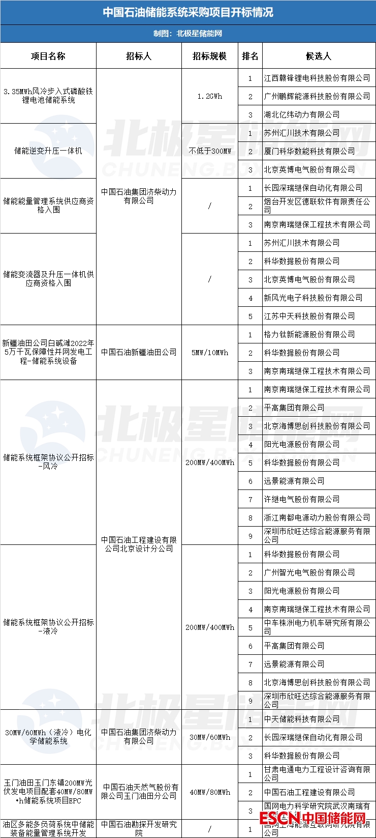 2022年,中國石油儲能系統(tǒng)采購項(xiàng)目吸引了贛鋒鋰電、鵬輝能源、格力鈦新能源、陽光能源、南瑞繼保、中車株洲、科華數(shù)據(jù)、平高集團(tuán)等27家國內(nèi)儲能龍頭企業(yè)參與競標(biāo),總規(guī)模約為2.15GWh。開標(biāo)情況如下: