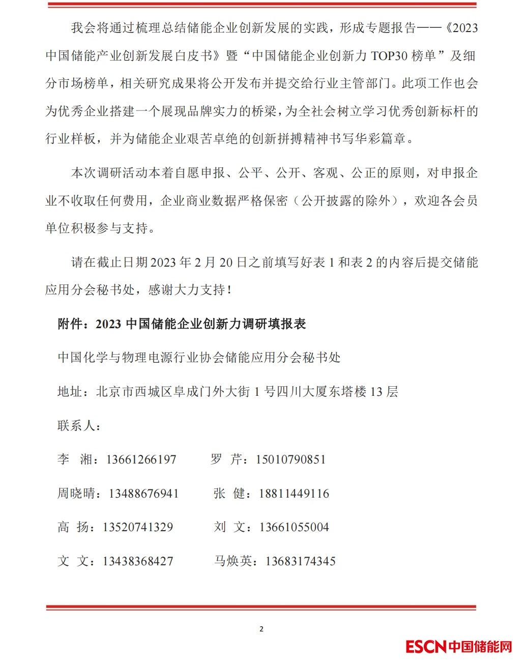 請在截止日期2023年2月20日之前填寫好表1和表2的內容后提交儲能應用分會秘書處,感謝大力支持!