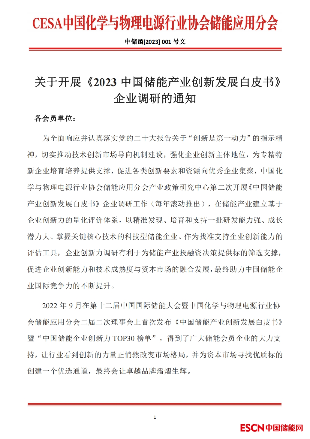 為全面響應并認真落實黨的二十大報告關于“創(chuàng)新是第一動力”的指示精神,切實推動技術創(chuàng)新市場導向機制建設,強化企業(yè)創(chuàng)新主體地位,為專精特新企業(yè)培育培養(yǎng)提供支撐,促進各類創(chuàng)新要素和資源向優(yōu)秀企業(yè)集聚,中國化學與物理電源行業(yè)協(xié)會儲能應用分會產業(yè)政策研究中心第二次開展《中國儲能產業(yè)創(chuàng)新發(fā)展白皮書》企業(yè)調研工作(每年滾動推出),在儲能產業(yè)建立基于企業(yè)創(chuàng)新力的量化評價體系,以精準發(fā)現、培育和支持一批研發(fā)能力強、成長潛力大、掌握關鍵核心技術的科技型儲能企業(yè)。作為找準支持企業(yè)創(chuàng)新能力的評估工具,企業(yè)創(chuàng)新力調研有利于為儲能產業(yè)投融資決策提供標的篩選支撐,促進企業(yè)創(chuàng)新能力和技術成熟度與資本市場的融合發(fā)展,最終助力中國儲能企業(yè)國際競爭力的不斷提升。