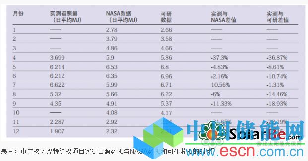 中廣核敦煌特許權(quán)電站在站內(nèi)架設(shè)的太陽輻射監(jiān)測儀記錄了去年一年的數(shù)據(jù),但由于儀器的問題并沒有得到全年的所有數(shù)據(jù)。但根據(jù)其中8個月的數(shù)據(jù)來看(見表三),實測輻照量與NASA數(shù)據(jù)和可行性研究的數(shù)據(jù)最大參考誤差超過30%。