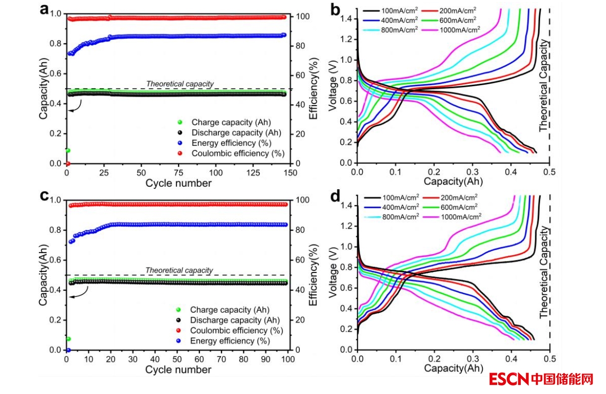 最終篩選出的Li||Sb20Bi60Sn10Pb10和Li||Sb50Bi30Sn10Pb10液態(tài)金屬電池具有綜合優(yōu)異的性能,并通過0.5 Ah級(jí)別液態(tài)金屬電池進(jìn)行測(cè)試驗(yàn)證,如圖2所示。Li||Sb20Bi60Sn10Pb10電池在500℃運(yùn)行溫度下以100 mA cm-2穩(wěn)定運(yùn)行150循環(huán),平均放電容量為0.47 Ah,庫(kù)倫效率為99%,能量效率為87%,放電能量可達(dá)0.28Wh,即使在大電流密度下(1000 mA cm-2),其能量效率也接近60%,具有優(yōu)異的電化學(xué)性能。而Li||Sb50Bi30Sn10Pb10電池則具有最高的能量密度(~280 Wh/kg)和最低的成本(~70 $/kWh),其庫(kù)倫效率為98%,且在大電流密度下(1000 mA cm-2),其容量保持率依舊高達(dá)90%。