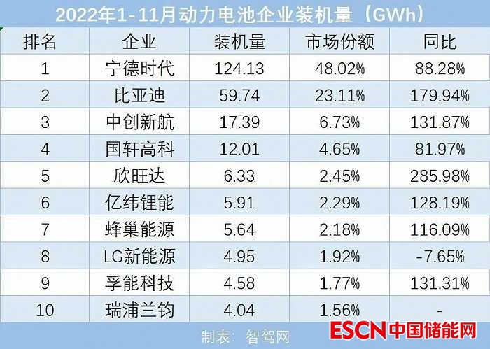 其中,寧德時代在營收規(guī)模上已連續(xù)五年拿下全球第一,其2022年1-11月動力電池的裝機量為124.13GWh,同比增長了88.23%,占據(jù)的市場份額高達48.02%。