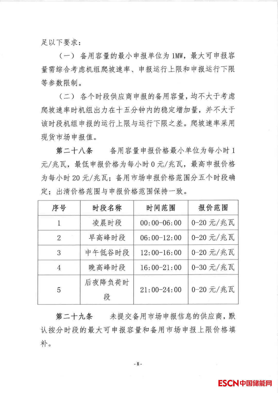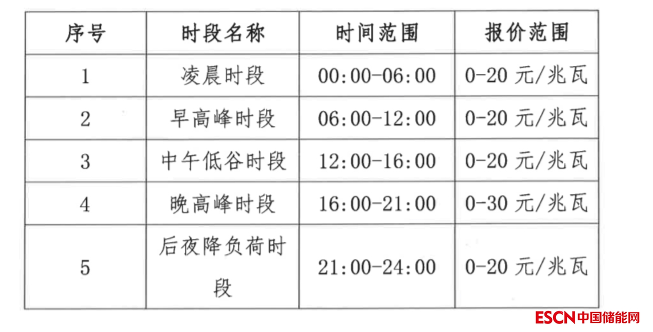 備用容量申報價格最小單位為每小時1元/兆瓦,最低申報價格為每小時0元/兆瓦,最高申報價格為每小時20元/兆瓦;備用市場申報價格范圍分五個時段確定;出清價格范圍與申報價格范圍保持一致。