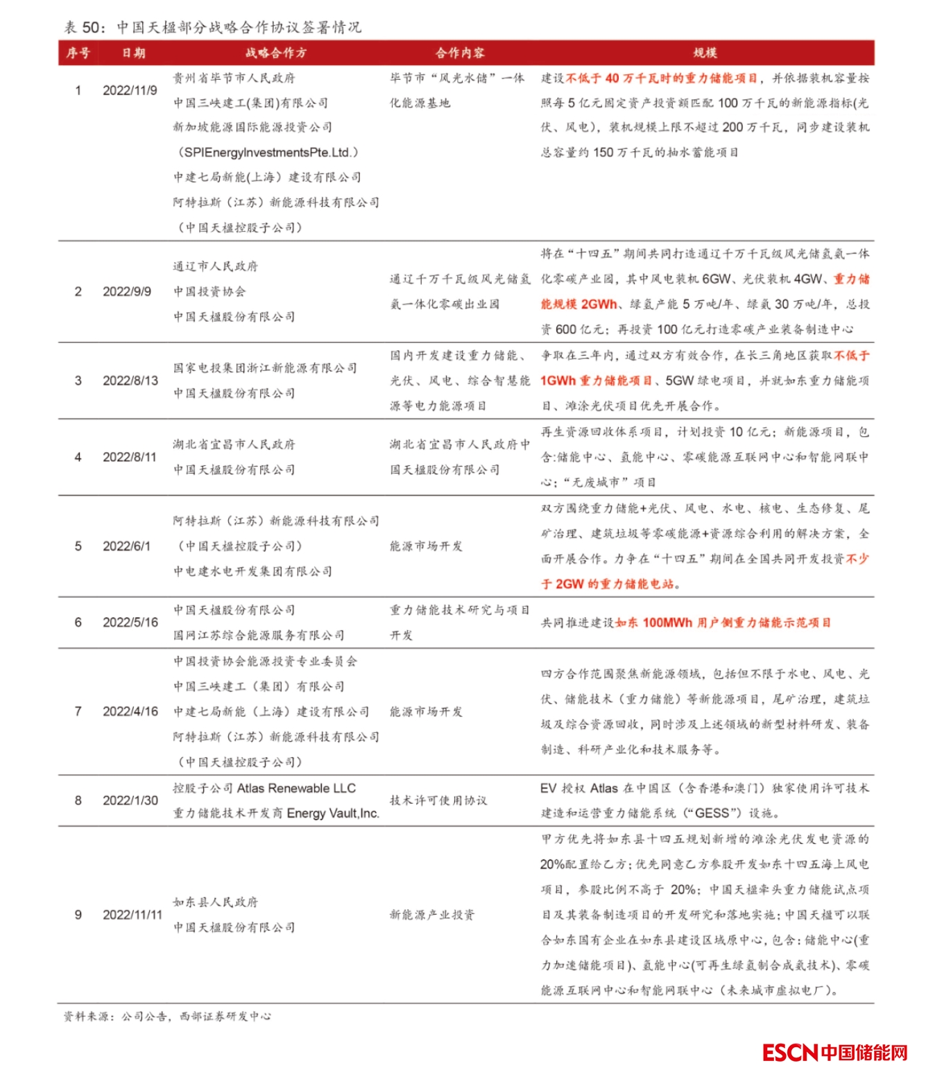今年以來中國天楹先后簽署多個重力儲能戰(zhàn)略合作協(xié)議。今年以來,中國天楹與貴州畢節(jié)人民政府、內(nèi)蒙通遼市人民政府、湖北省宜昌市人民政府、中國投資協(xié)會、三峽建工、中建七局、國家電投、中電建、國網(wǎng)綜能等單位達成戰(zhàn)略合作,合作內(nèi)容均有涉及重力儲能。畢節(jié)市“風光水儲”一體化能源基地,將建設(shè)不低于40萬千瓦時的重力儲能項目;通遼千萬千瓦級風光儲氫氨一體化零碳產(chǎn)業(yè)園,重力儲能規(guī)模2GWh;與國家電投浙江公司協(xié)議中,在長三角地區(qū)獲取不低于1GWh重力儲能項目;與中電建水電公司協(xié)議中,力爭在“十四五”期間在全國共同開發(fā)投資不少于2GW的重力儲能電站。
