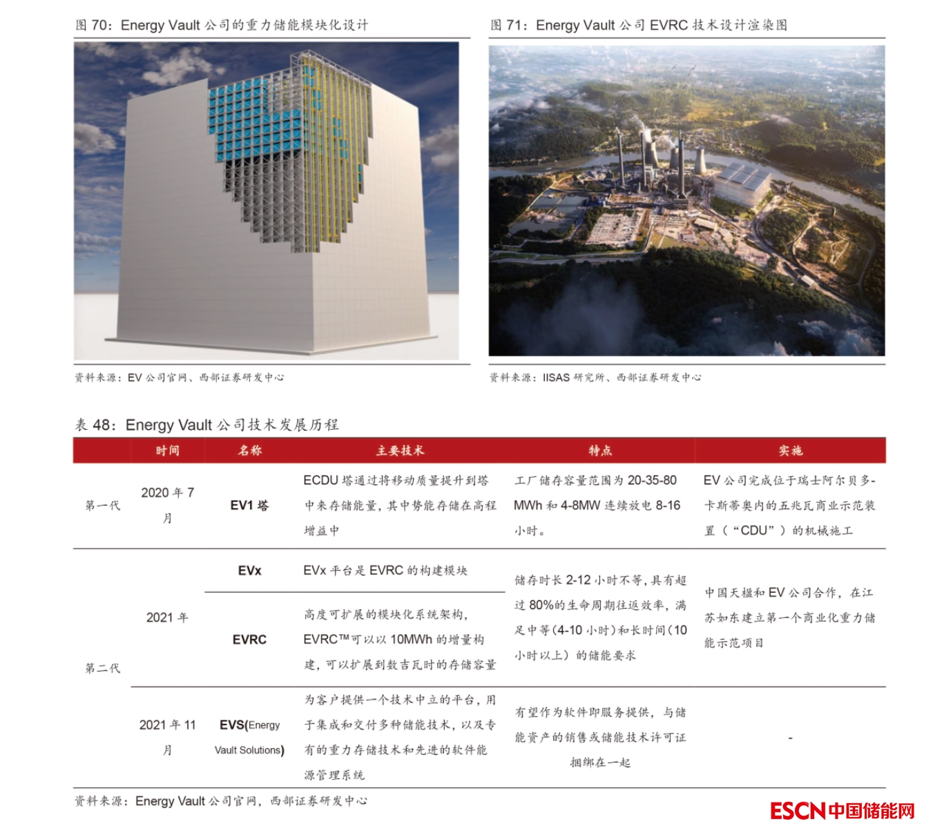 Energy Vault公司提出混凝土砌塊儲能,開拓重力儲能新方向。在基于構(gòu)筑物高度差的重力儲能技術(shù)路徑中,Energy Vault公司提出以混凝土砌塊儲能塔為基礎(chǔ)的重力儲能發(fā)電方案,其原理是電力充裕時,起重機將儲能模組EVx從地上吊起,像積木一樣往高處堆放,當模組堆疊在高處時,系統(tǒng)完全“充電”,每個儲能模組代表約1MW 的勢能;當需要電力時,系統(tǒng)會協(xié)調(diào)儲能模組EVx排出。2020年,EV公司在初期儲電吊塔EV1產(chǎn)品的基礎(chǔ)上研發(fā)了可以進行機組模塊拼裝的 EVRC 儲能產(chǎn)品,并在瑞士當?shù)亟ㄔO(shè)了一些項目示范中心,與當?shù)仉娋W(wǎng)嫁接進行項目試驗。2021年推出了EVx 平臺,其儲能模組EVx和彈性中心EVRC儲能容量在10MWh以上,可滿足電網(wǎng)2~12小時的彈性儲能。