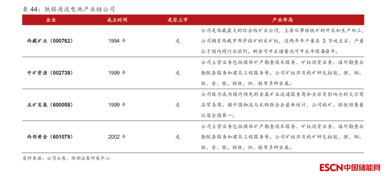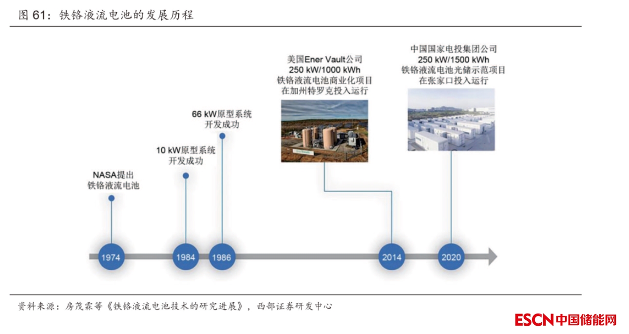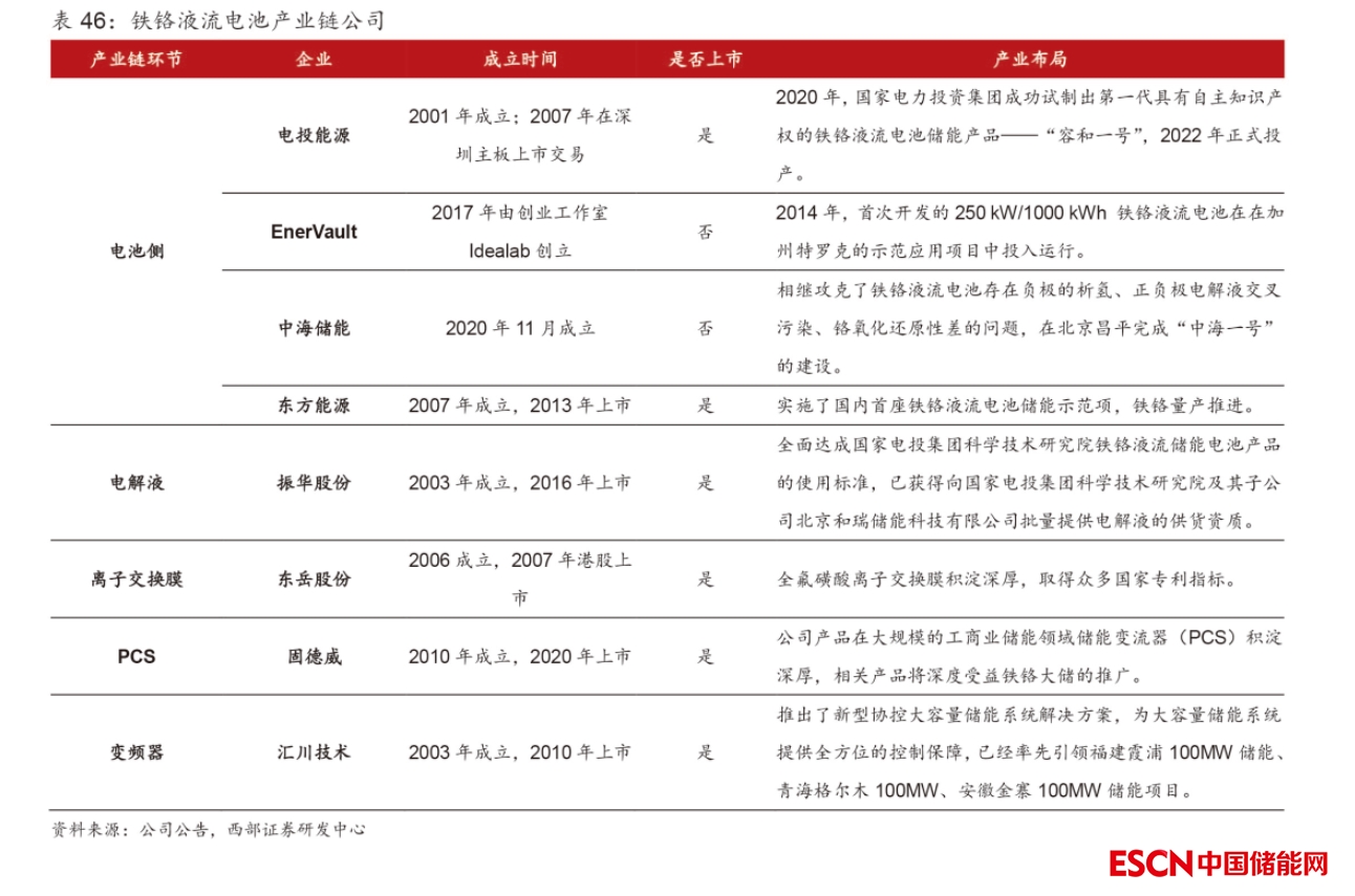 下游儲能:國內(nèi)對鐵/鉻液流電池的研究始于20世紀90年代,早期以跟蹤研究為主。中科院大連化學物理研究所的衣寶廉院士團隊于1992年曾經(jīng)推出過270W 的小型鐵/鉻液流電池電堆。中科院大連化物所和沈陽的金屬所的研究中,負極析氫與電解液離子互混問題長期難以解決。2019年11月,中國國家電投公司所屬的中央研究院和上海發(fā)電設(shè)備成套設(shè)計研究院聯(lián)合項目團隊研發(fā)的國內(nèi)首個 31.25kW 鐵/鉻液流電池電堆“容和一號”成功下線,經(jīng)測試,性能指標滿足設(shè)計參數(shù)要求。首批次共8臺電堆,應(yīng)用于張家口戰(zhàn)石溝光伏電站250kW/1.5MWh鐵-鉻液流電池儲能示范項目,并已于 2020年12月投入試運行,成為國內(nèi)首座百千瓦級鐵-鉻液流電池儲能示范電站。2022年1月,“容和一號”量產(chǎn)線投產(chǎn),單條產(chǎn)線可年產(chǎn)5000臺“容和一號”電堆,標志著鐵/鉻液流電池儲能技術(shù)產(chǎn)業(yè)化向前邁進了一大步,為液流電池儲能技術(shù)帶來了新的增長點。與此同時,國家電投還在內(nèi)蒙古霍林河啟動了全球首個兆瓦級鐵/鉻液流電池儲能示范項目建設(shè),預(yù)計將在22年年底投產(chǎn),屆時將再度刷新全球鐵/鉻液流電池儲能系統(tǒng)的最大實證容量紀錄。