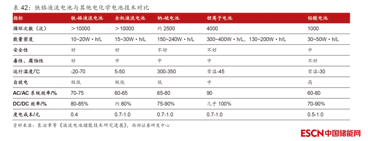 2. 劣勢:鐵鉻電池負極活性弱,容易受制于 Cr 離子金屬特性而產(chǎn)生析氫問題。鐵-鉻液流電池負極 Cr2+/Cr3+電對相較于正極 Fe2+/Fe3+電對在電極上的反應(yīng)活性較差,是影響電池性能的主要原因之一。且 Cr3+離子電化學反應(yīng)活性較差、易老化、易發(fā)生析氫反應(yīng)、容量衰減快、能量效率低等原因仍然限制著鐵鉻液流電池商業(yè)化發(fā)展。另外反應(yīng)過程中電池正負極電解液一定程度上會形成交叉感染,所以需要配備循環(huán)泵、電控設(shè)備等輔助設(shè)備,增加了系統(tǒng)的復(fù)雜性。