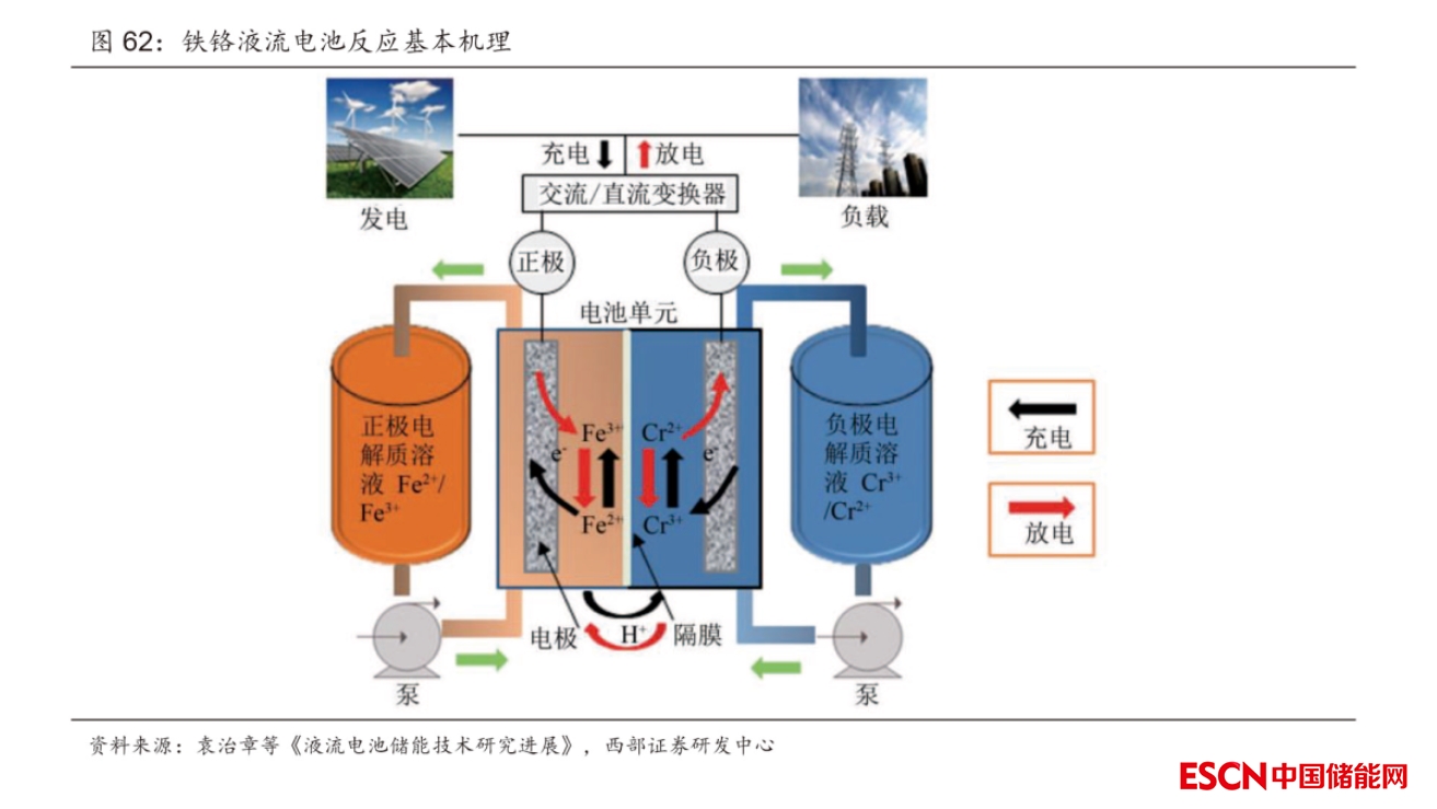 鐵鉻液流電池是產(chǎn)業(yè)上最早出現(xiàn)的液流電池技術(shù),利用鐵鉻電對的價態(tài)變化實現(xiàn)能量轉(zhuǎn)換。鐵鉻電池分別采用 Fe3+/Fe2+電對和 Cr3+/Cr2+作為正極和負極的活性物質(zhì),通過活性金屬的價態(tài)變化實現(xiàn)電能與化學能相互轉(zhuǎn)換與能量儲存。在鐵鉻液流電池中,活性物質(zhì)儲存于電解液中,具有流動性,可以實現(xiàn)電化學反應(yīng)場所(電極)與儲能活性物質(zhì)在空間上的分離,電池功率與容量設(shè)計相對獨立,適合大規(guī)模蓄電儲能需求。