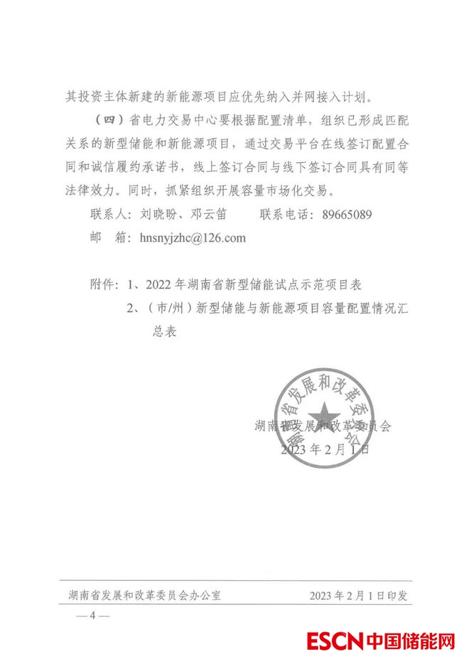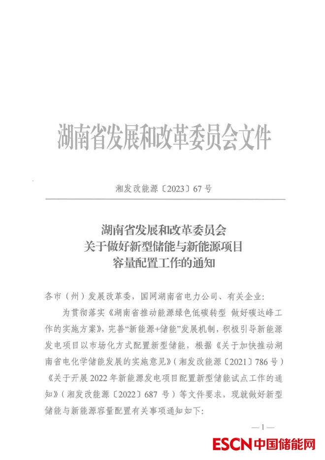 按照湖南發(fā)改委相關(guān)文件,新能源項(xiàng)目應(yīng)配置一定容量的新型儲能,于2022年12月底前,2023年6月底前全容量并網(wǎng)運(yùn)行的新型儲能試點(diǎn)項(xiàng)目分別按其裝機(jī)容量的1.5倍、1.3倍計算所配新能源容量。