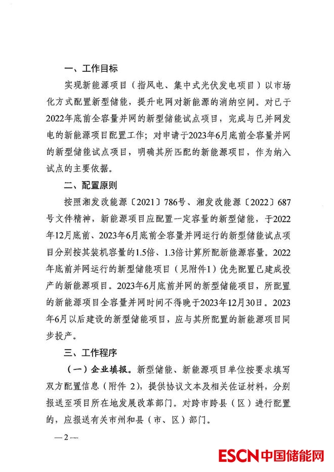 中國儲能網(wǎng)訊:近日,湖南省發(fā)改委下發(fā)關(guān)于做好新型儲能與新能源項(xiàng)目容量配置工作的通知。其中通知表示,對已于2022年底前全容量并網(wǎng)的新型儲能試點(diǎn)項(xiàng)目,完成與已并網(wǎng)發(fā)電的新能源項(xiàng)目配置工作;對申請于2023年6月底前全容量并網(wǎng)的新型儲能試點(diǎn)項(xiàng)目,明確其所匹配的新能源項(xiàng)目,作為納入試點(diǎn)的主要依據(jù)。