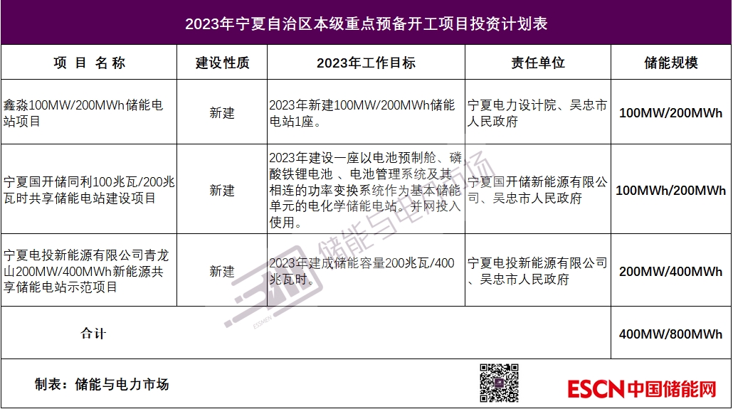 6個重點建設(shè)的儲能項目+3個重點預(yù)備開工儲能項目,寧夏2023年重點項目總計包含9個儲能項目,總規(guī)模1.45GW/ 3.3GWh;其中,2023年至少將建成獨立儲能電站4座,涉及儲能總規(guī)模500MW/1000MWh。