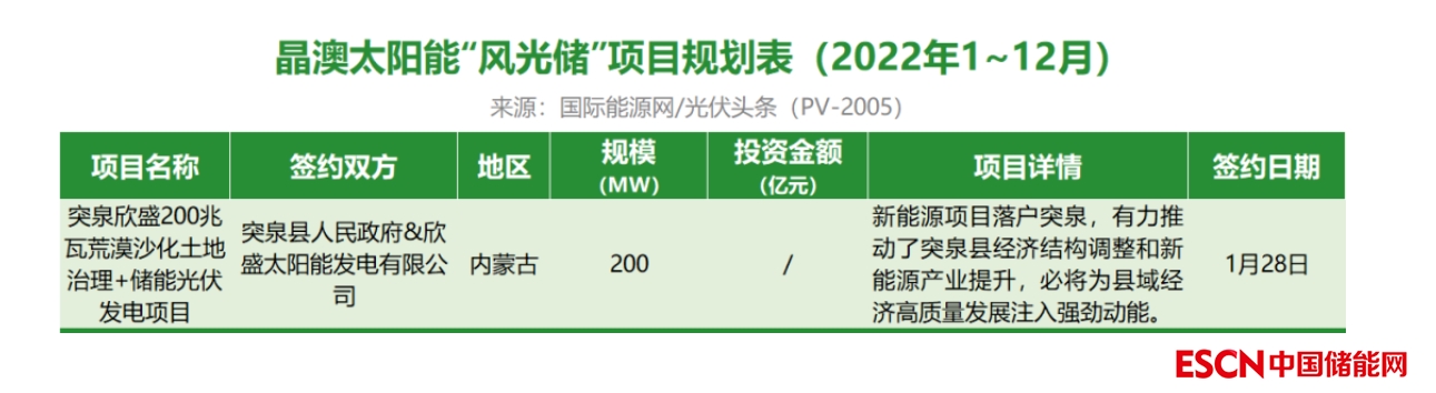 截至2022年12月31日,晶澳太陽能共簽約(規(guī)劃)1個風光儲項目,項目規(guī)模為200MW。