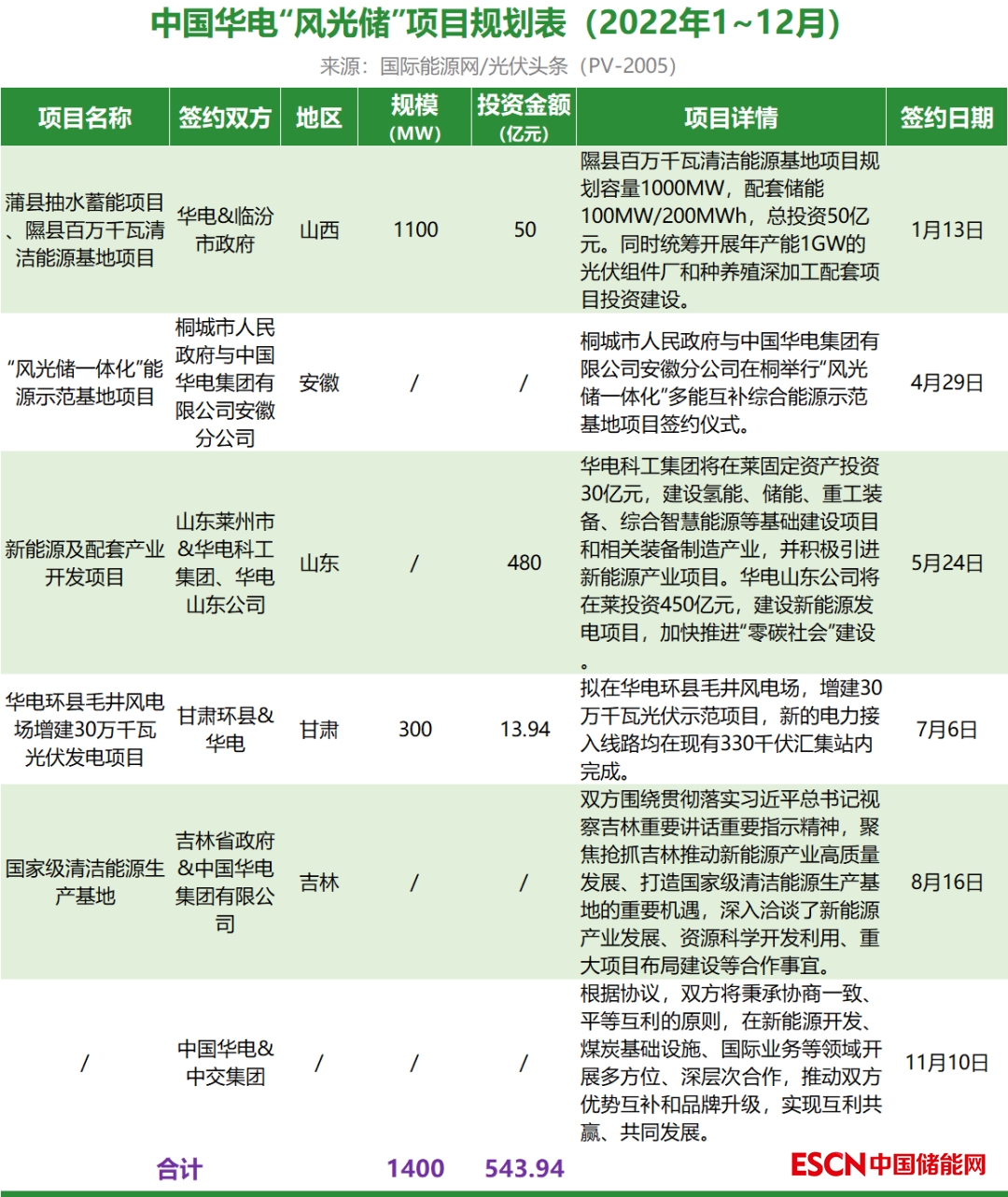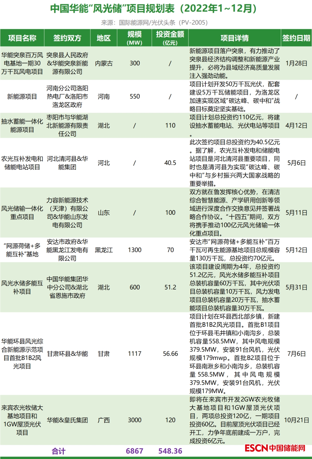 截至2022年12月31日,華能共簽約(規(guī)劃)9個風光儲項目,明確規(guī)模共計6.867GW,有7個項目明確投資金額共計548.36億元。