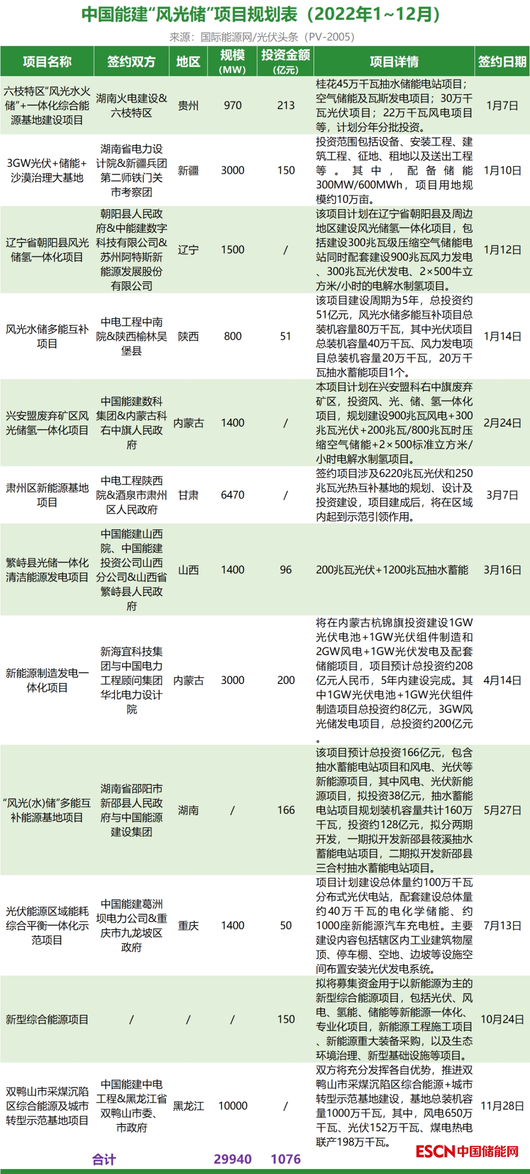 截至2022年12月31日,中國能建共簽約(規(guī)劃)12個風光儲項目,明確項目規(guī)模共計29.94GW。此外,有8個項目明確投資金額,共1076億元。