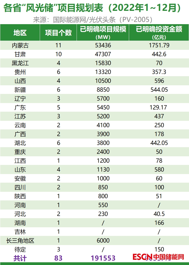 據(jù)國際能源網(wǎng)/光伏頭條(PV-2005)統(tǒng)計,2022年全國共簽約/規(guī)劃風光儲項目83個,已明確的項目規(guī)模為191.553GW,已明確的投資金額為6633.46億元。