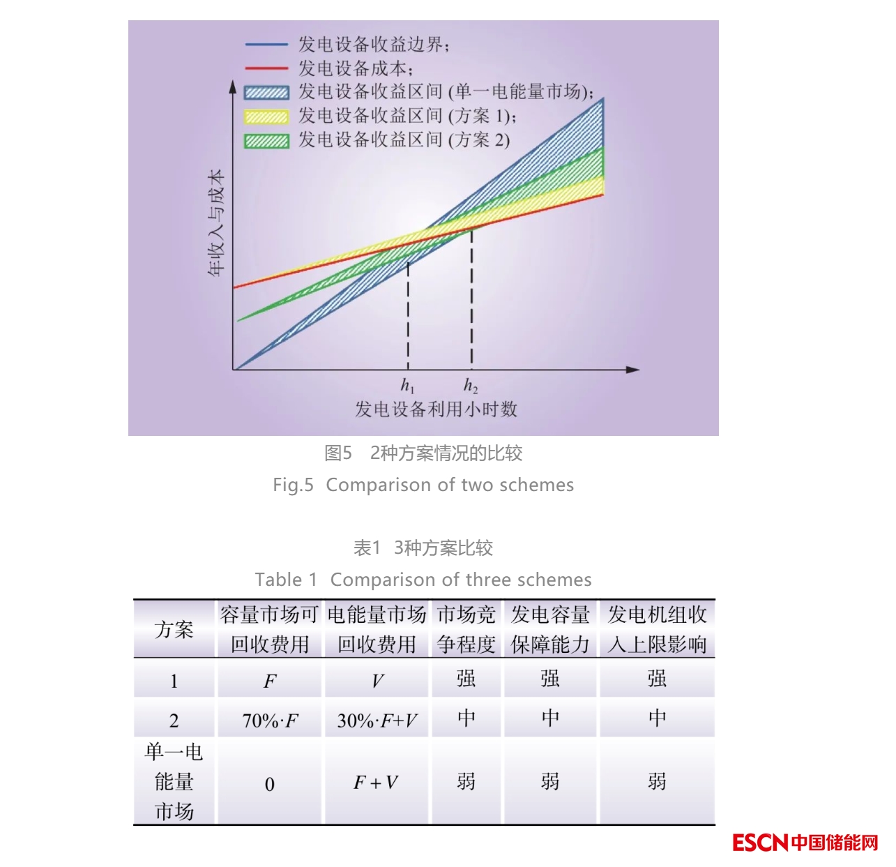 2種方案情況的收益情況比較如圖5所示。本文所提方案與單一電能量市場的情況比較如表1所示。表1中: F 為發(fā)電設(shè)備的固定成本; V 為發(fā)電企業(yè)的變動(dòng)成本。結(jié)合圖5和表1可以看出:(1)方案2的發(fā)電設(shè)備有固定成本回收壓力。該方案下單位發(fā)電量的期望收益上升時(shí),收益區(qū)間將增大。在發(fā)電設(shè)備利用小時(shí)數(shù)大于一定值時(shí),方案2的發(fā)電設(shè)備收益高于方案1的發(fā)電設(shè)備收益,從而導(dǎo)致用戶用能價(jià)格稍高。(2)方案1可以減少固定成本回收壓力,從而促進(jìn)發(fā)電商按照邊際成本報(bào)價(jià),加劇市場競爭,有利于釋放電力市場建設(shè)進(jìn)程中的改革紅利,降低用戶用能成本。方案2可以促進(jìn)發(fā)電商發(fā)電積極性,以更高的發(fā)電量獲得更好收益。(3)方案1包含了發(fā)電設(shè)備的全部固定成本,可以有力保證所需發(fā)電容量的經(jīng)營情況,故其對(duì)全系統(tǒng)發(fā)電容量有強(qiáng)力的保障。發(fā)電設(shè)備需在電能量市場競爭從而回收30%的固定成本,方案2對(duì)發(fā)電容量保障能力相對(duì)弱于方案1。