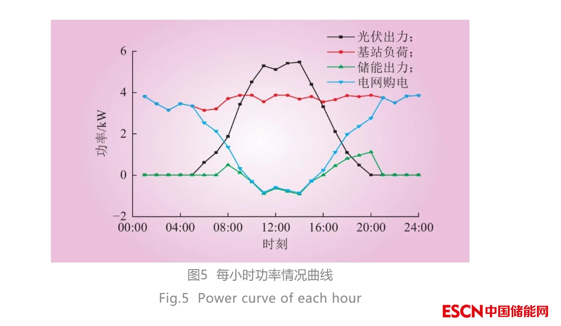 由圖5可以看出,00:00—05:00和23:00—24:00時段光伏發(fā)電出力為0,電網(wǎng)購電量等于基站能耗;05:00—07:00時段光伏設(shè)備開始發(fā)電,光伏出力小于基站能耗,系統(tǒng)從電網(wǎng)購電,電網(wǎng)購電量等于基站能耗減去光伏出力;07:00—09:00時段光伏出力小于基站能耗,系統(tǒng)仍從電網(wǎng)購電,此時處于電價高峰時段,儲能放電來減少一定的購電成本,電網(wǎng)購電量等于基站能耗減去光伏出力和儲能放電量之和;09:00—16:00時段光伏出力大于基站能耗,儲能充電,光伏在滿足基站能耗和儲能充電量后的多余出力向電網(wǎng)售電;16:00—19:00時段電價處于高峰時段,光伏出力小于基站能耗,儲能放電為基站提供部分電量,電網(wǎng)購電量等于基站能耗減去光伏出力與儲能放電量之和;19:00—20:00時段光伏發(fā)電出力為0,電價仍處于高峰時段,儲能放電,但放電量小于基站能耗,系統(tǒng)需從電網(wǎng)購電;20:00—23:00時段光伏發(fā)電出力為0,分時電價處于平時段,儲能不工作,電網(wǎng)購電量等于基站能耗。