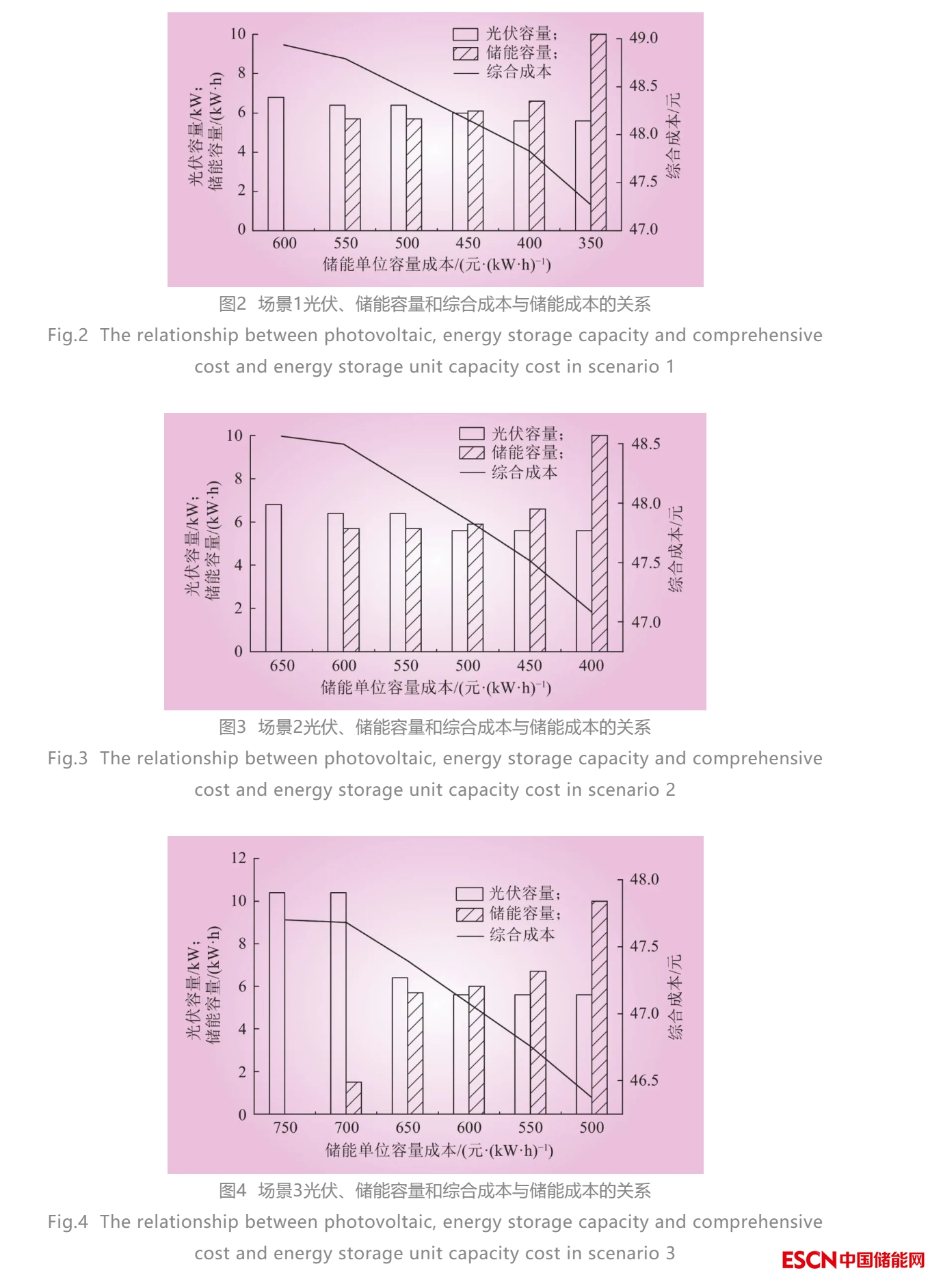(3)光伏發(fā)電的配置容量受分時電價和儲能容量的影響。在一定程度上峰谷價差越大,光伏發(fā)電容量越大;儲能容量增大,光伏容量逐漸減小,當(dāng)光伏容量小于某閾值時,配置光伏不具有經(jīng)濟(jì)性,因此光伏容量減小至某閾值后將不再減小。