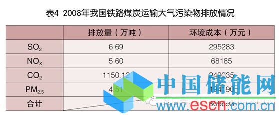 根據(jù)《中華人民共和國鐵道部2008年鐵道統(tǒng)計公報》,2008年全國鐵路貨物發(fā)送量完成329035萬噸,煤炭運量完成169146萬噸,占51.41%。全國鐵路貨物周轉(zhuǎn)量為23360.32億噸公里,煤炭周轉(zhuǎn)量為8360.28億噸公里。根據(jù)鐵道部統(tǒng)計中心得出的鐵路運輸大氣污染排放因子,可計算出2008年我國煤炭鐵路運輸?shù)奈廴疚锱欧帕?,結(jié)合前文計算出的大氣污染物環(huán)境成本,可得煤炭鐵路運輸?shù)沫h(huán)境成本,如表4所示。2008年我國火力發(fā)電總量為278573680.4萬千瓦時,由此可計算煤炭鐵路運輸?shù)沫h(huán)境成本Ce(鐵路運輸)=0.0029元/千瓦時。