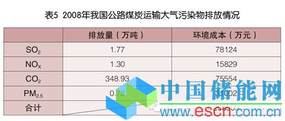 根據(jù)《2009年公路水路交通行業(yè)發(fā)展統(tǒng)計公報》,2008年我國公路貨運平均運距為171.48公里,總周轉(zhuǎn)量為1664.35億噸公里,水路貨運平均運距為1706.66公里,總周轉(zhuǎn)量為6952.93億噸公里。結(jié)合公路與水路運輸主要排放因子的數(shù)值,可計算出2008年我國煤炭公路運輸?shù)奈廴疚锱欧帕?,由前文計算出的大氣污染物環(huán)境成本,可得煤炭公路運輸?shù)沫h(huán)境成本,如表5所示。2008年我國火力發(fā)電總量為278573680.4萬千瓦時,由此可計算煤炭公路運輸?shù)沫h(huán)境成本Ce(公路運輸)=0.0007元/千瓦時。