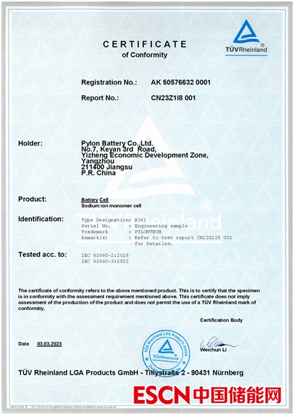 中國儲能網訊:3月3日,上海派能能源科技股份有限公司(以下簡稱派能科技)收到德國萊茵TüV集團(以下簡稱TüV萊茵)頒發(fā)的關于鈉離子電池認證證書,該證書為TüV萊茵頒發(fā)的全球首張鈉離子電池認證證書。