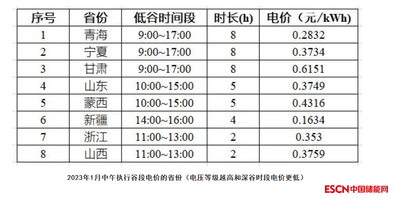 2022年底,多個(gè)省份對(duì)用戶銷售電價(jià)進(jìn)行調(diào)整,主要調(diào)整了峰、平、谷時(shí)段,拉大了峰谷價(jià)差。根據(jù)各省發(fā)布的電網(wǎng)代理購電價(jià)格顯示,至少有8?。▍^(qū))在中午光伏出力高峰期執(zhí)行谷段電價(jià),具體見下表: