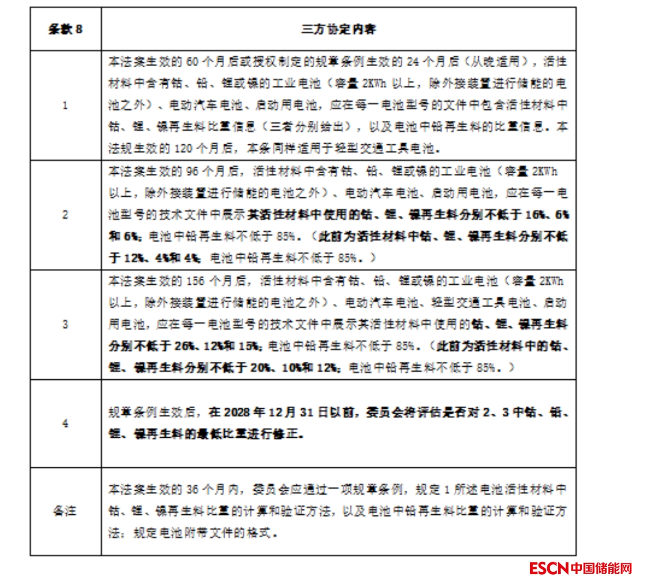 表、協(xié)定稿條款8部分:工業(yè)電池、電動汽車電池、啟動用電池的再生料含量