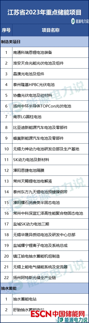 江蘇省2023年重點儲能項目共24個項目,包含22個儲能產(chǎn)品制造類項目和2個抽水蓄能項目。