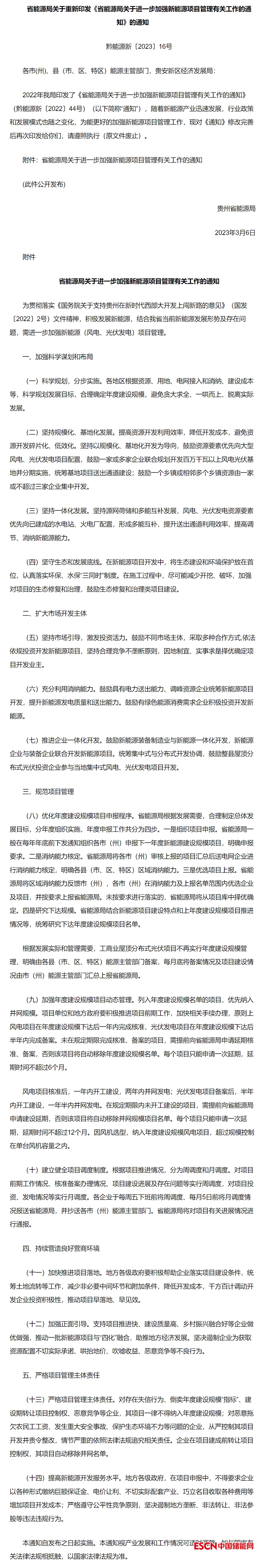 中國儲(chǔ)能網(wǎng)訊:3月10日,貴州省能源局發(fā)布關(guān)于重新印發(fā)《省能源局關(guān)于進(jìn)一步加強(qiáng)新能源項(xiàng)目管理有關(guān)工作的通知》。據(jù)悉,該通知在2022年6月第一次發(fā)布,本次重新印發(fā),通知中的政策延續(xù)。