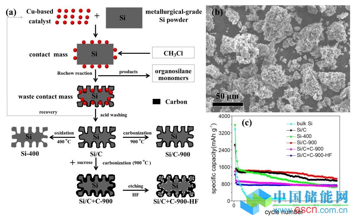 他們借鑒有機(jī)硅單體合成工業(yè)過程,以工業(yè)硅粉和氯甲烷為原料,通過有機(jī)硅行業(yè)廣泛使用的Rochow反應(yīng),利用多種銅基催化劑在溫和條件下制備出多孔硅/碳復(fù)合材料,通過簡單后處理工藝得到硅/碳復(fù)合負(fù)極材料。電化學(xué)測試表明,在循環(huán)100周之后仍然保持了1000mAh/g左右的容量。同時制備過程中副產(chǎn)的多種有機(jī)硅單體可作為有機(jī)硅材料的原料,銅催化劑可回收利用。目前我國有機(jī)硅單體產(chǎn)量每年約200萬噸,消耗的硅粉原料約50萬噸。若將有機(jī)硅單體生產(chǎn)過程設(shè)備與多孔硅材料的制備相結(jié)合,控制合適的生產(chǎn)工藝條件,將有望解決多孔硅/碳復(fù)合負(fù)極材料的低成本規(guī)模化制備的問題。該制備工藝過程和負(fù)極材料已獲得發(fā)明專利授權(quán)(利用硅與鹵代烴催化反應(yīng)制備多孔硅材料的方法,ZL201010146666.X;一種鋰離子電池硅基負(fù)極復(fù)合材料及其制備方法,ZL201110268147.5)。