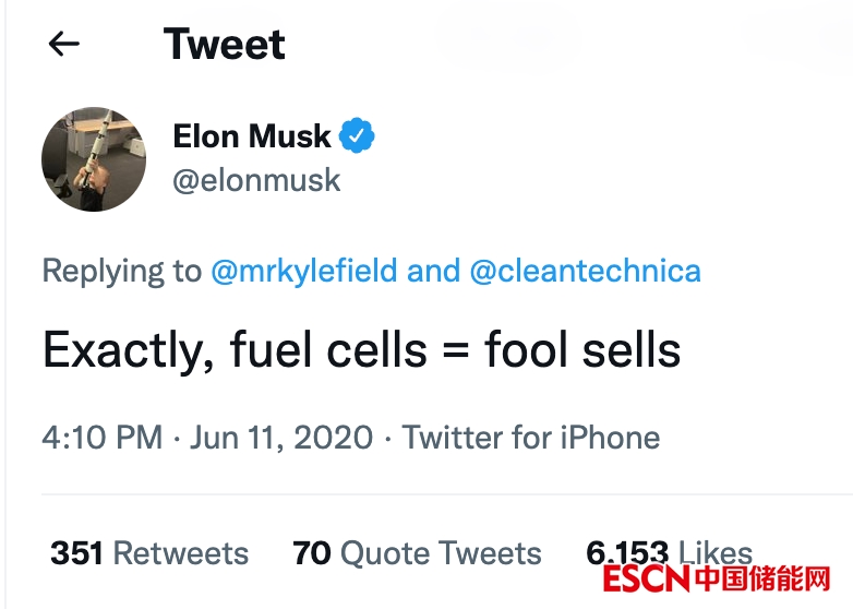 馬斯克有對氫氣和氫燃料電池發(fā)表強烈意見的歷史。幾年前,當這個問題在汽車新聞世界大會上與記者討論時,這位電動汽車巨頭將氫燃料電池描述為“非常愚蠢”。2020年6月,他在推特上發(fā)布了“燃料電池=傻瓜銷售”,并在當年7月補充說:“氫的‘傻瓜出售’毫無意義?!?