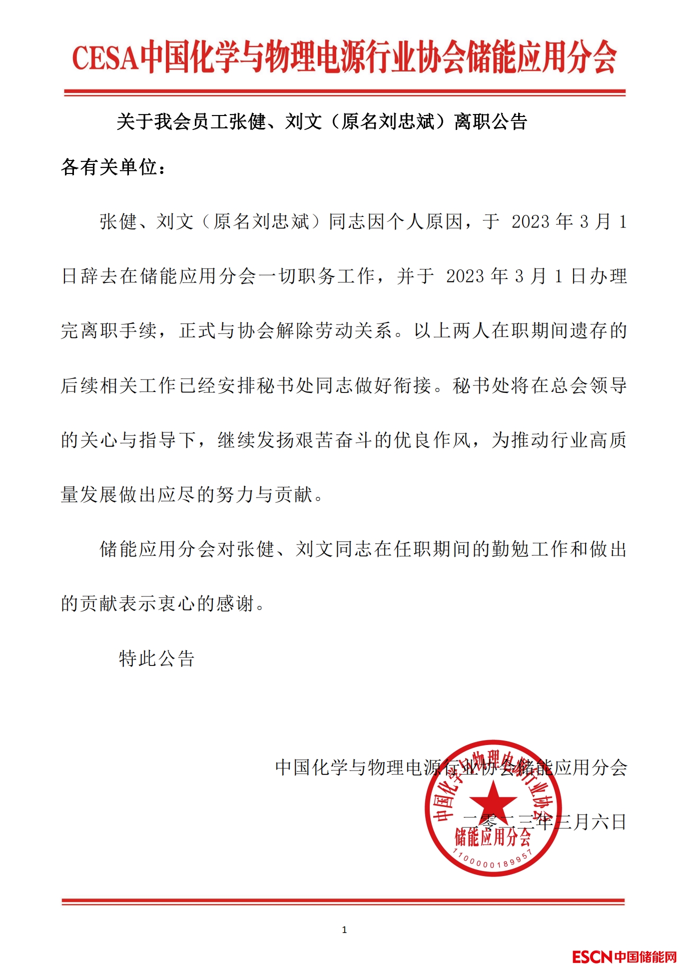 張健、劉文(原名劉忠斌)同志因個(gè)人原因,于 2023年3月1日辭去在儲(chǔ)能應(yīng)用分會(huì)一切職務(wù)工作,并于 2023年3月1日辦理完離職手續(xù),正式與協(xié)會(huì)解除勞動(dòng)關(guān)系。以上兩人在職期間遺存的后續(xù)相關(guān)工作已經(jīng)安排秘書處同志做好銜接。秘書處將在總會(huì)領(lǐng)導(dǎo)的關(guān)心與指導(dǎo)下,繼續(xù)發(fā)揚(yáng)艱苦奮斗的優(yōu)良作風(fēng),為推動(dòng)行業(yè)高質(zhì)量發(fā)展做出應(yīng)盡的努力與貢獻(xiàn)。