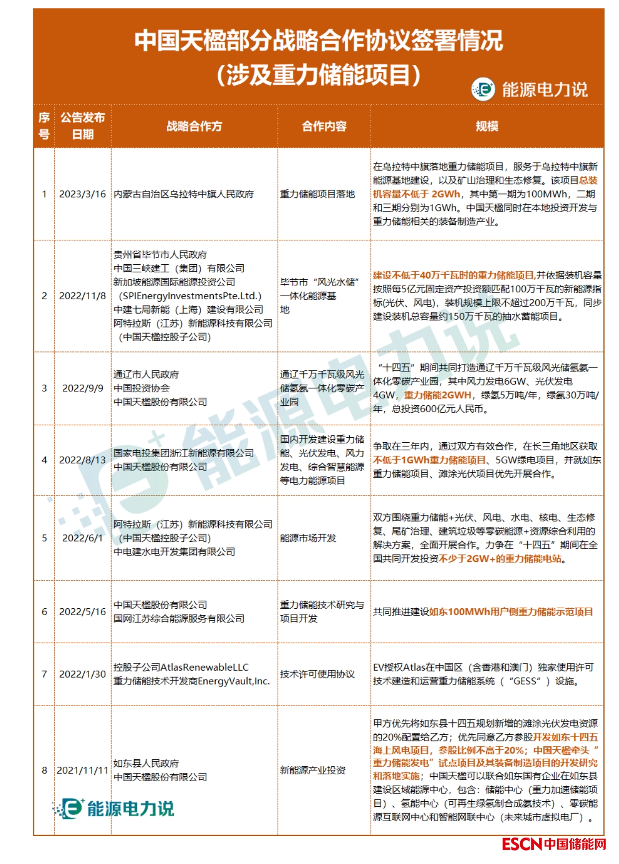 2022年以來(lái),中國(guó)天楹與內(nèi)蒙烏拉特中旗人民政府、貴州畢節(jié)人民政府、內(nèi)蒙通遼市人民政府、中國(guó)投資協(xié)會(huì)、三峽建工、中建七局、國(guó)家電投、中電建、國(guó)網(wǎng)綜能等單位達(dá)成戰(zhàn)略合作,合作內(nèi)容均有涉及重力儲(chǔ)能。
