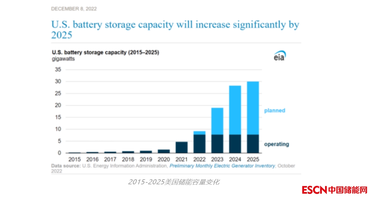 在 2020 年之前,美國的儲能容量可以忽略不計,這一年之后則迅速增加。截至 2022 年 10 月,全美已有7.8 GW 的大規(guī)模儲能設(shè)施開始運(yùn)營,且預(yù)計到年底還將增加 1.4 GW 的儲能容量。EIA 預(yù)計 2023 年至 2025 年將增加 20.8 GW 的儲能容量。儲能容量的增長速度超過了太陽能裝機(jī)容量的早期增長速度。美國的太陽能容量從 2010 年開始擴(kuò)張,從 2010 年的不到 1吉瓦增長到 2015 年的 13.7 吉瓦。